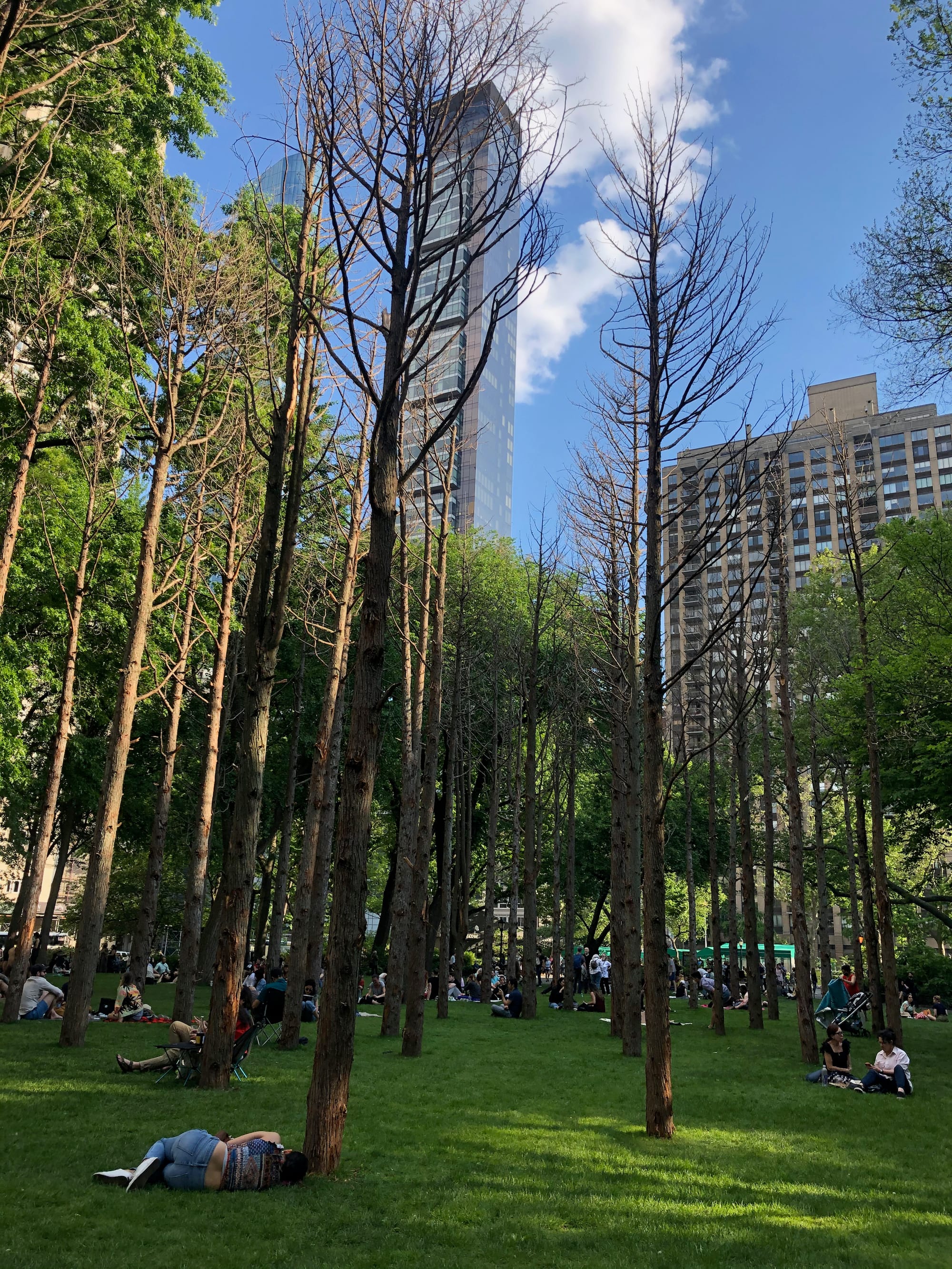 As New Yorkers begin to surface from our losses in this pandemic year, I wonder whether we’ll “reflect on our past in order to help guide us to a different future,” as Lin urges, or instead, as a park visitor remarked, “return to BC (before Covid)” because introspection, community building, and envisioning a sustainable, equitable future different from the reality we’ve known is hard work. Observing picnickers who didn’t seem to notice the addition of the dead cedars in the park, one might have cynically concluded that people just don’t notice or care about their environment. But I believe the opposite: The ghost trees and animals simply blended into the living surroundings, reminding us of a pivotal conviction that is held by many indigenous cultures. We have the ancestral memory to restore the Earth and our relations if only we committed to valuing and nurturing that knowledge.