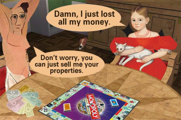 At left, MoMA’s “Demoiselles D’Avignon” (1907) by Picasso, at right, the American Folk Art Museum’s “Girl in Red Dress With Cat and Dog” (1830-35) by Ammi Phillips playing Monopoly. (image courtesy Hyperallergic’s multi-billion-dollar digital department)