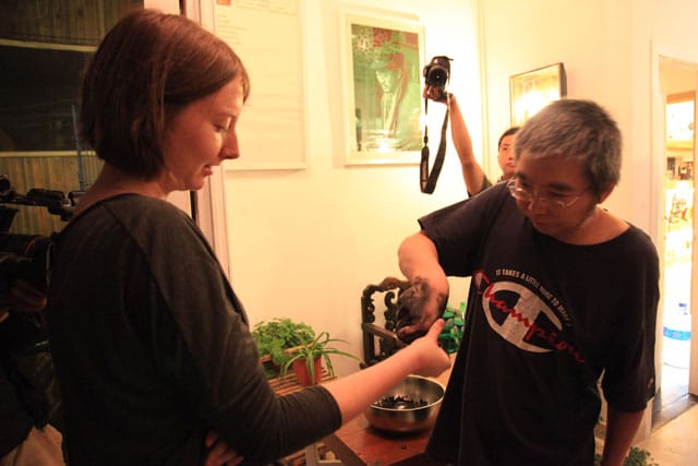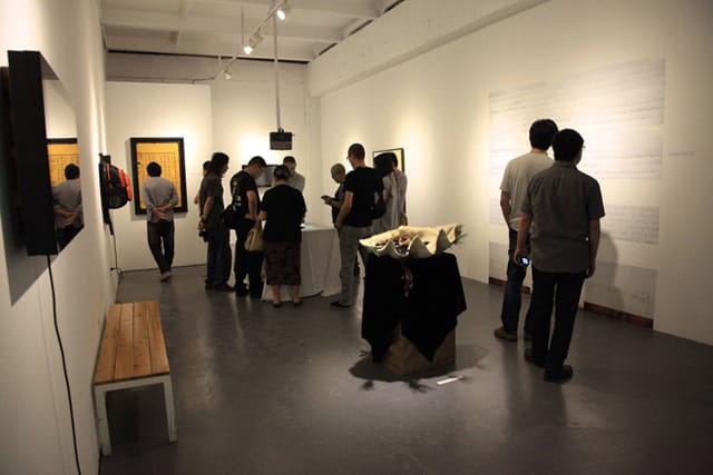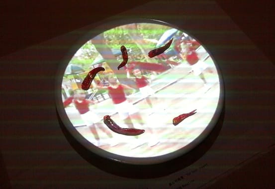 At the opening, a large number of video pieces were turned off. This included Ai Weiwei’s “4851” (made up of the list of names of the Sichuan children killed in the 2008 earthquake), Li Jie’s “Passby” (a snapshot collection of trainwrecks, collapsing bridges, and other malfunctions of the system that cost human lives), and Li Dazhi’s “Red Book” (a captivating video of Chinese schools’ physical exercise routines projected on a small ceramic plate filled with several red peppers), as well as Japanese artist Megumi Shimizu’s video. We were told that the videos would remain off until after 7pm, because that was the working schedule of the few plain-clothes policemen in the area, and after that time they would go home or out to dinner and get drunk.