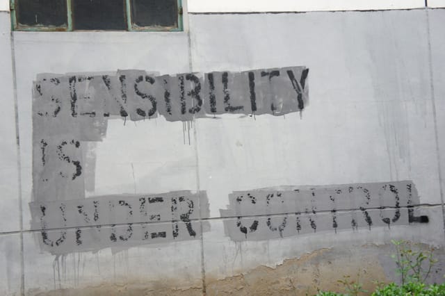 Among the confusion created by the carefully staged mis-en-scene (remarkably, the protest setting created by the party around the Japanese embassy in the Liangmaqiao neighborhood near Caochangdi became one of the best “site-specific installations” of the month), several Chinese artists took their chance to make a statement. During the summer, some of the walls of the area had been tagged with Chinese and English sentences advocating how sensibility was “under control,” courtesy of the Forgetart collective, and although they were quickly covered with thick layers of grey paint, the transparency of the varnish turned the tags into ambiguous visual signs (seen at top).