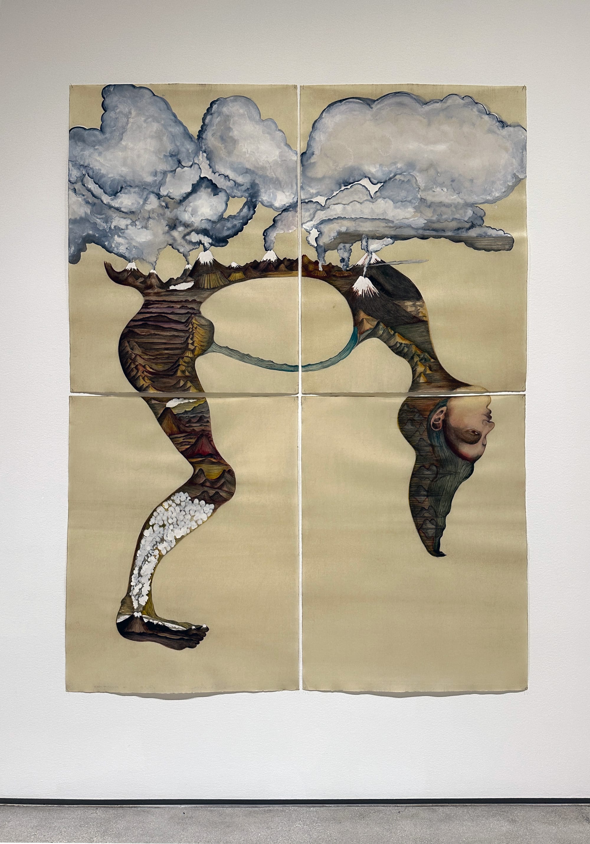Across nearly 100 drawings, female figures meet, merge, and cleave from mountain ranges, wild animals, citrus trees, and sprouting fungi, as well as elemental forces like water, lava, rainbows, and celestial bodies. In “Anillo de fuego (Ring of Fire)” (2023), a female figure is arched into a backbend, snowcapped volcanoes chugging smoke lining her abdomen. She is not separate from the earth, but of it, undifferentiated and indivisible. Another unframed, large-scale drawing on buttery yellow paper, “Deidad planetaria (Planetary Deity)” (2015), depicts a woman with serpents wrapped around her head and a stag positioned before her crotch; she stands with one foot on the globe, a wooden staff in her hand. In the clustered botanical works, ovaries, stamens, and pistils frame the reproductive machinery of plants and humans as variations on the same ecstatic impulse.