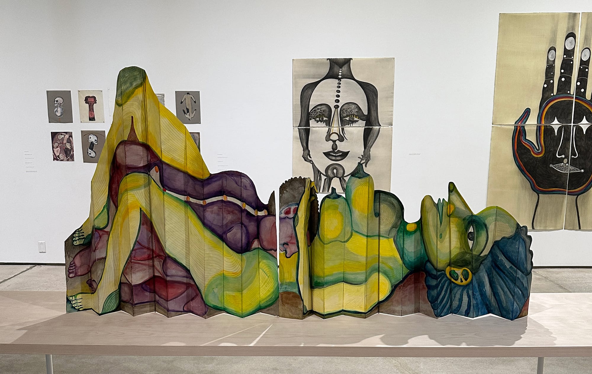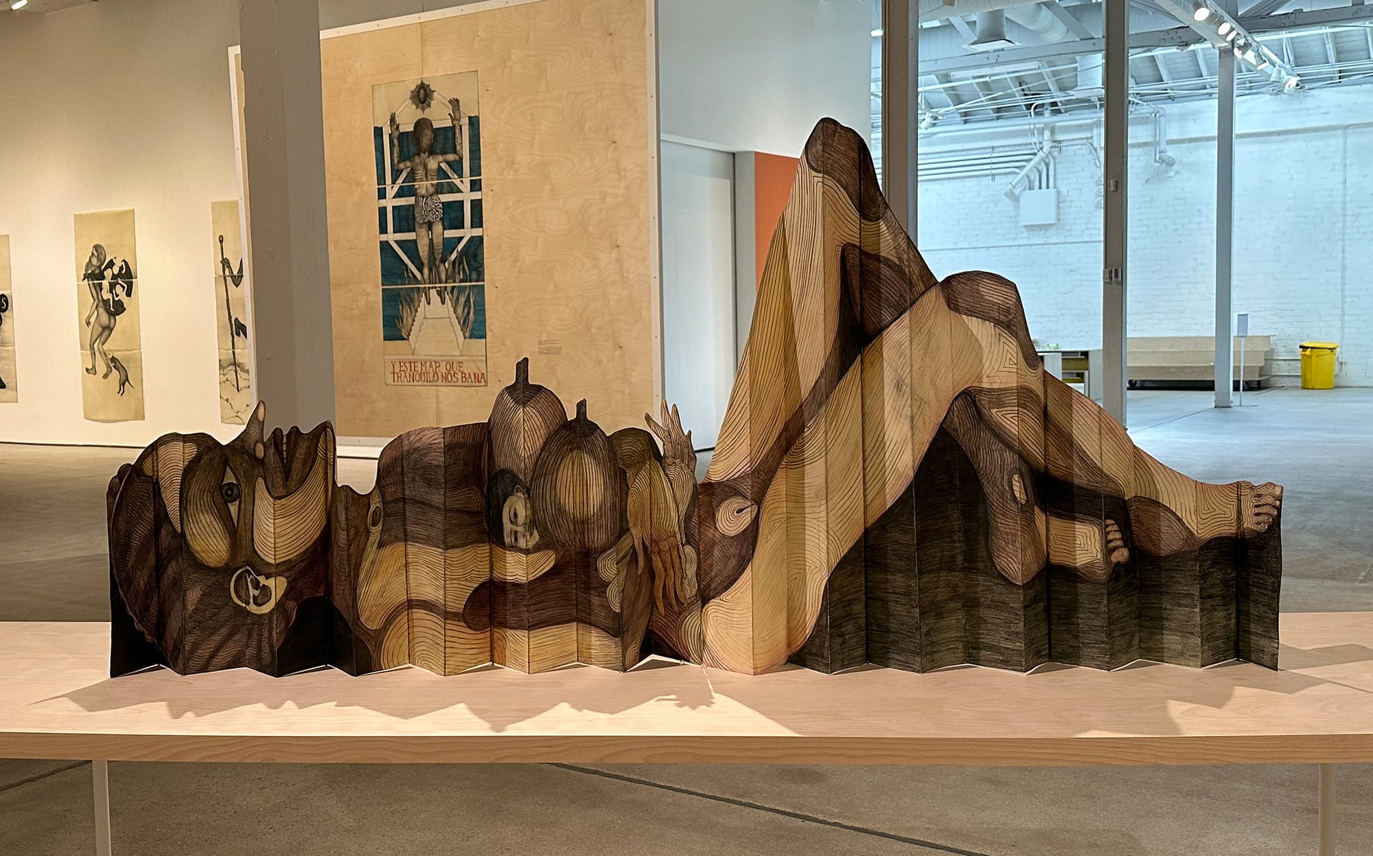 The entire show is full of this familiar strangeness. Flanking that first image are two accordion-folded paper sculptures of reclining women. In “Del sol naciente (From the Rising Sun)” (2023), an infant is cradled between the woman’s erect breasts; viewed from one side, her skin resembles wood grain — rooted but leaden, more instrument of the cycle of life than carnal body. From the other side, she is radiant, amber, and fuchsia: all heat and kinetic energy. The same dynamic appears in “Volver a ti (Coming Back to You)” (2023): vibrantly colored on one side, wooden on the other, except here the child at her chest is replaced by a man folded between her knees, his mouth at her navel. Show me a woman who hasn’t felt both objectified and embodied, burdened and revitalized by the demands of sex and child-rearing.