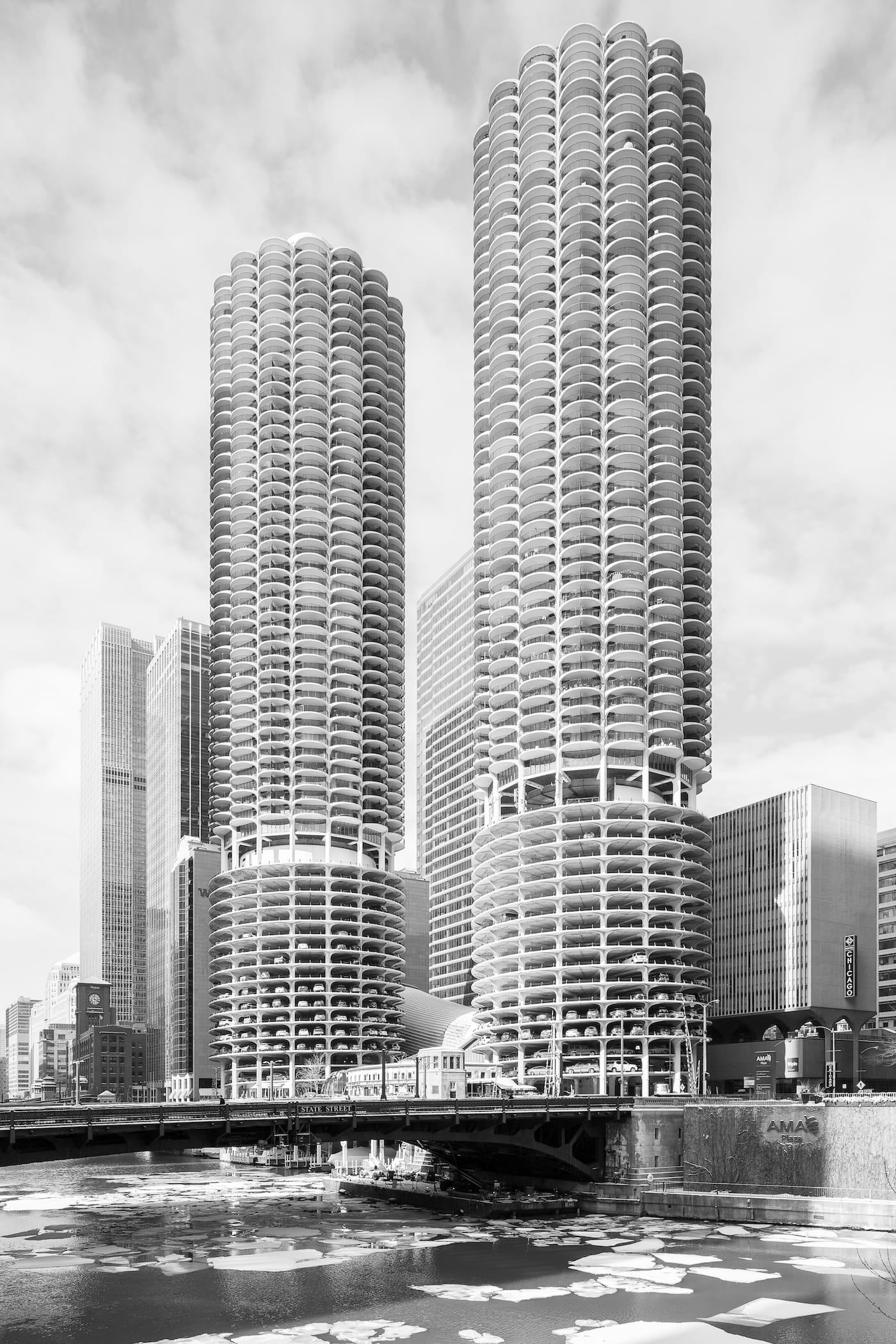 I’ll admit that my first real impression of Chicago architecture was as a young Wilco fan, seeing Bertrand Goldberg’s Marina City rise, in somewhat sinister form, on the cover of Yankee Hotel Foxtrot. I only saw the twin buildings in person for the first time last year, when I moved to Chicago. Up close, the corncob structures were bigger than I’d ever imagined, and I halted to survey their dizzying, petaled balconies. That’s the thing about concrete buildings: when executed with sculptural flair, their material, raw and tough, presents unparalleled, arresting drama.