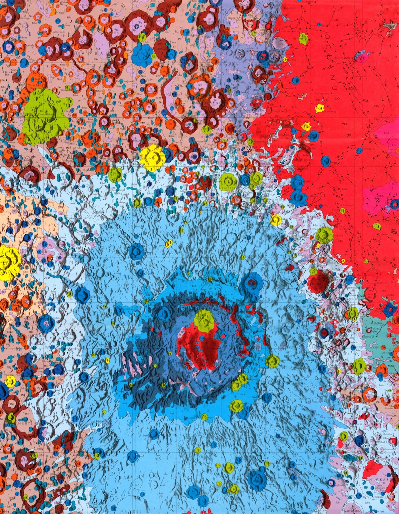 Seen from Earth, the moon glows a pure off-white, its craters sometimes visible in light gray shadow. When the moon hangs low on the horizon, molecules in our atmosphere filter blue and green light, causing the moon to appear yellow. Maps made by the US Geological Survey (USGS) offer a vastly different visual depiction of the Earth’s moon, using the full color spectrum to denote differences in topography and geology. The resulting images look like breathtaking abstractions.