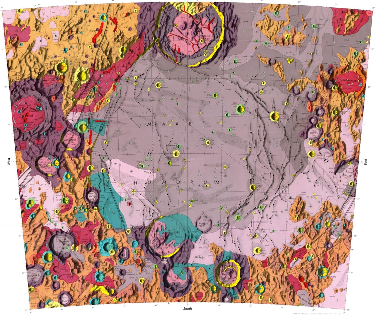 Maps made by the US Geological Survey offer a vastly different visual depiction of the Earth’s moon, using the full color spectrum to denote differences in topography and geology.
