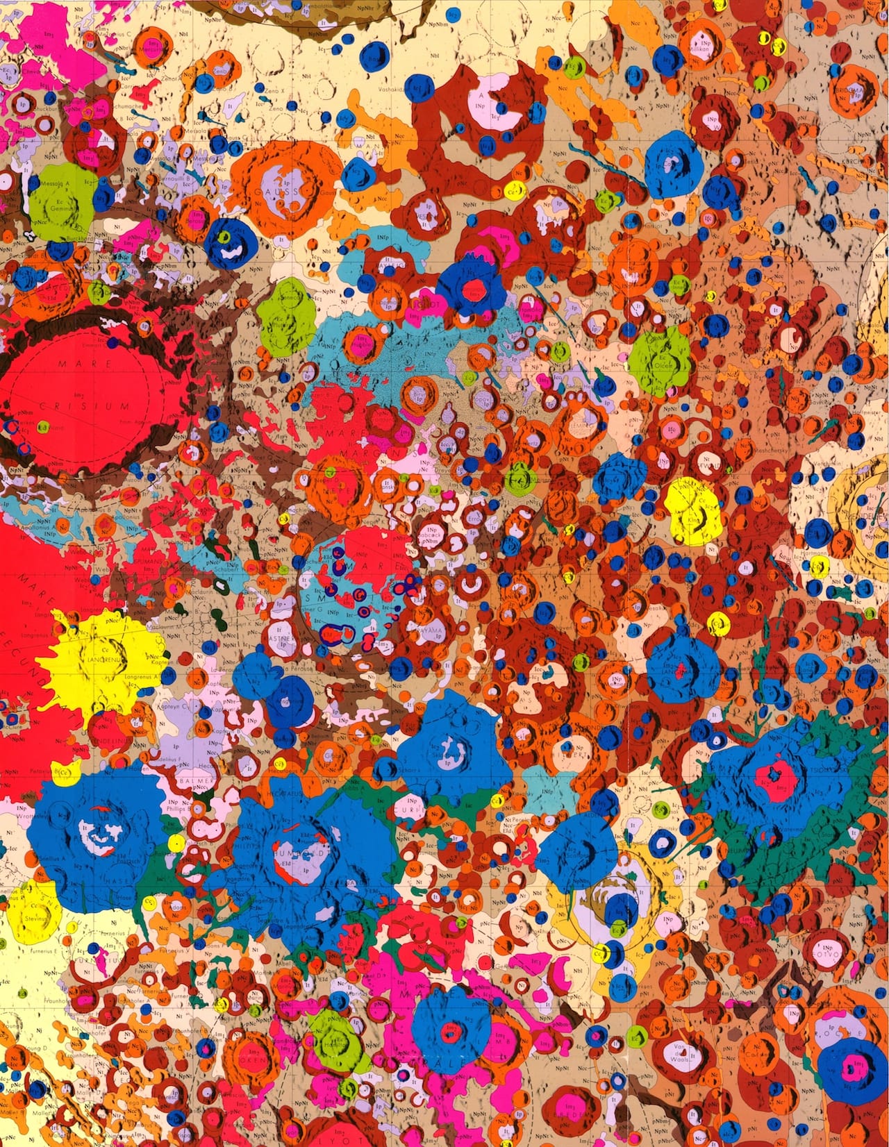 If one can attribute artistic qualities to visuals not created with artistic intent, the compositional logic behind these maps might be understood as an inversion of process art: Pollack’s abstractions were created by pure impulse, these works by immutable pairings of specific hues with geological substances. The results are gorgeous meditations on color, especially moving for the way they upend our usual understanding of the moon’s surface as cold, monochromatic, and distant.