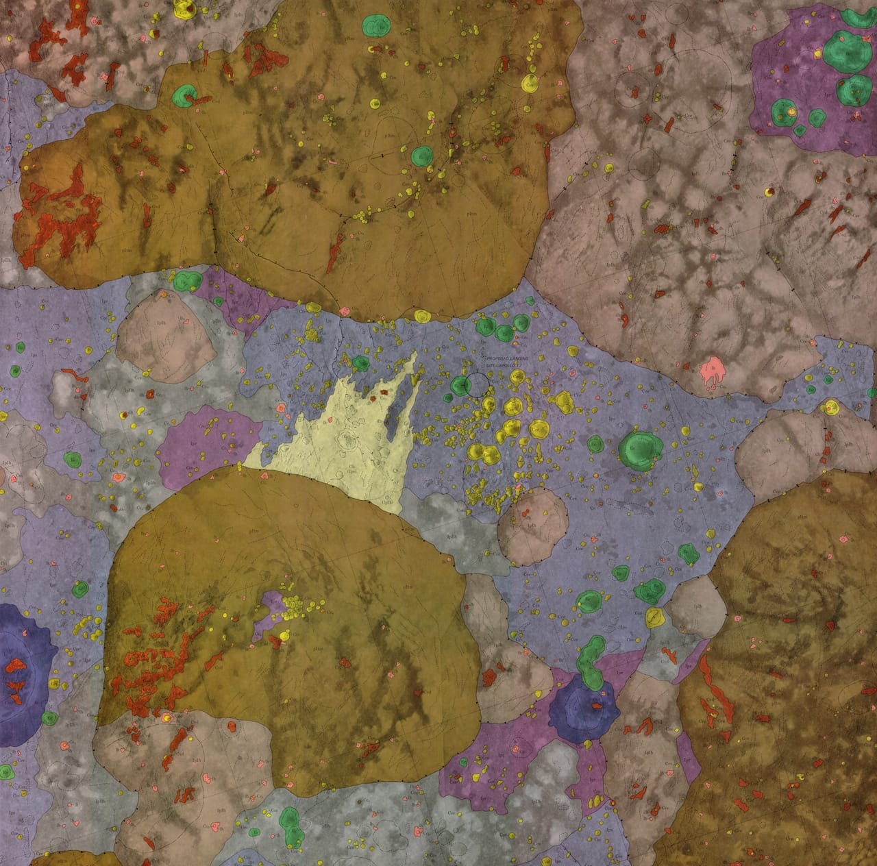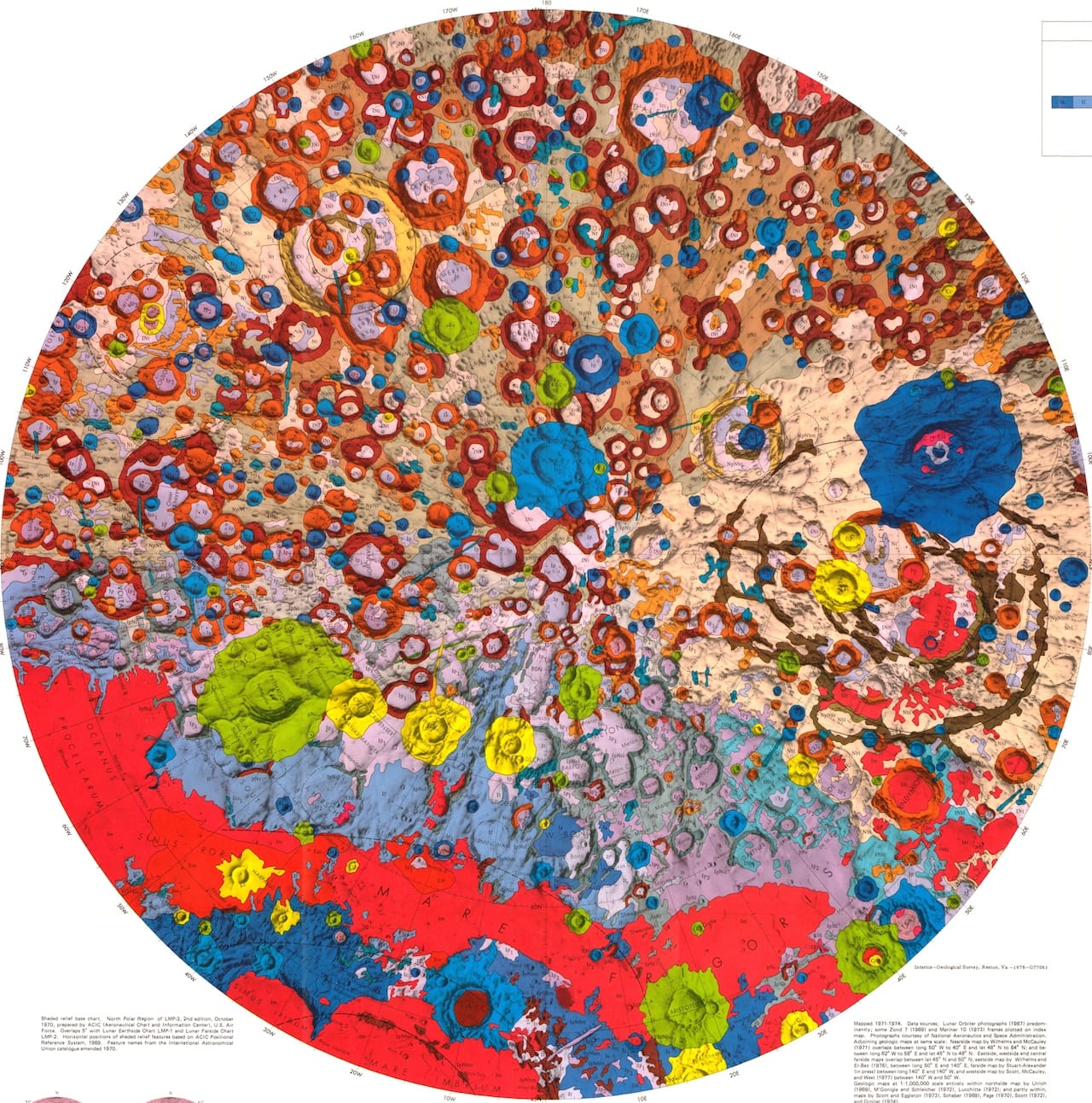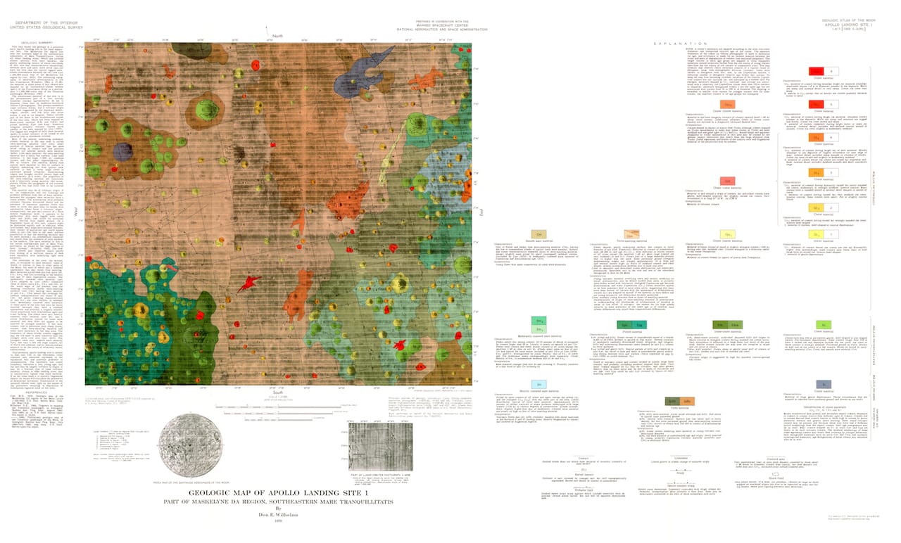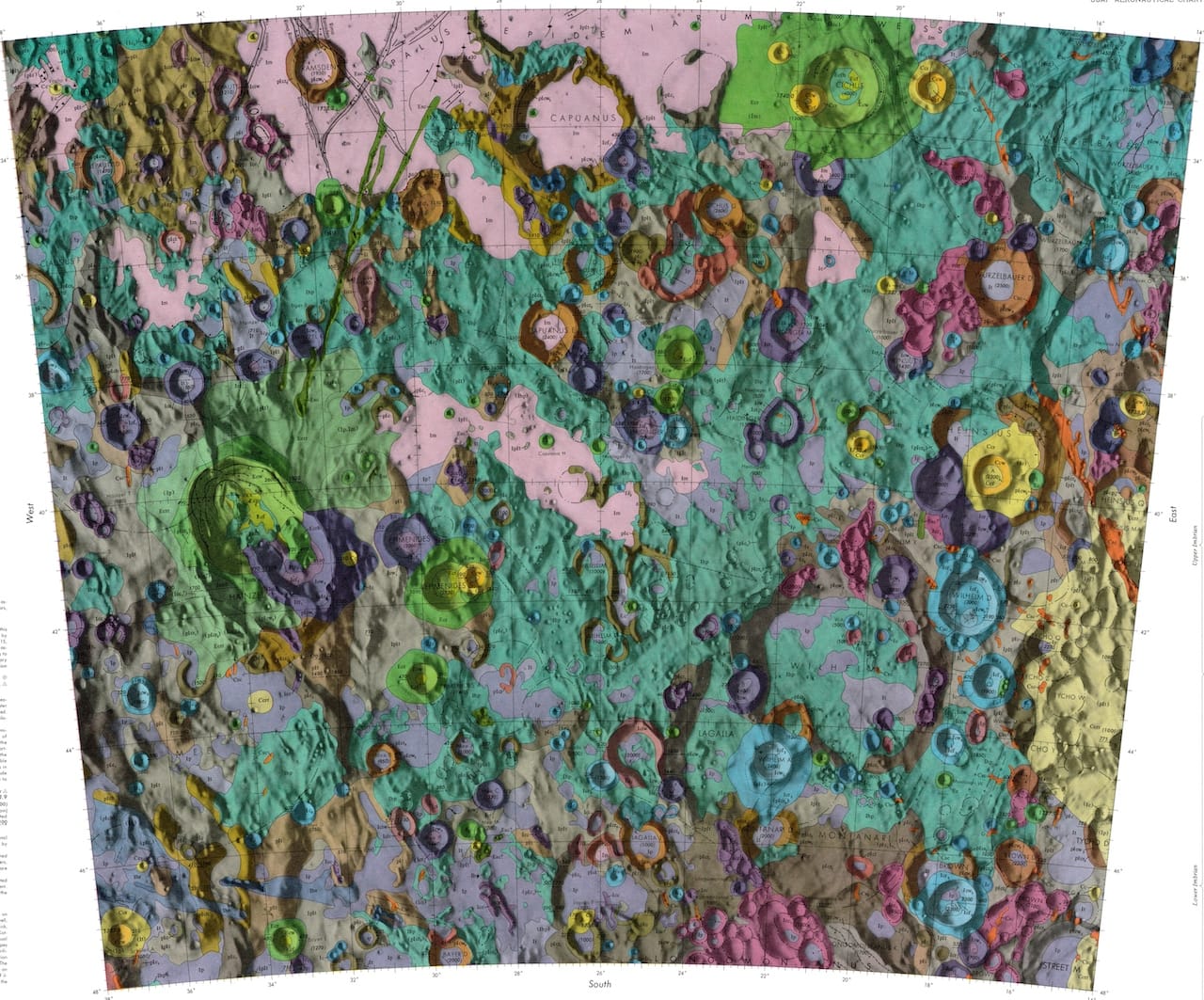 The geologic moon atlas maps use a color-coding scheme to refer to different types of terra, mare, crater, and other materials. Each image records a specific portion of the moon’s surface. The maps vary in scale from 1:5,0000 to 1:5,000,000, and some of the smaller ones function as zoomed-in versions of larger ones. All hail from the 1960s and 1970s, and their focus betrays the concerns of the era: six maps from 1970 portray the variety of landing sights considered for the Apollo moon landing of 1969.
