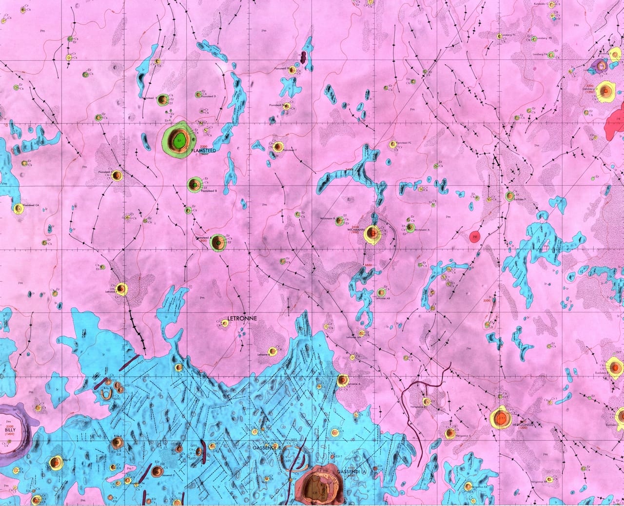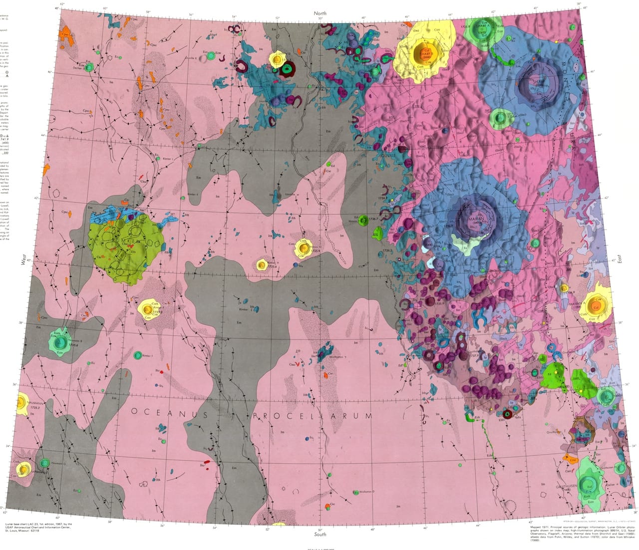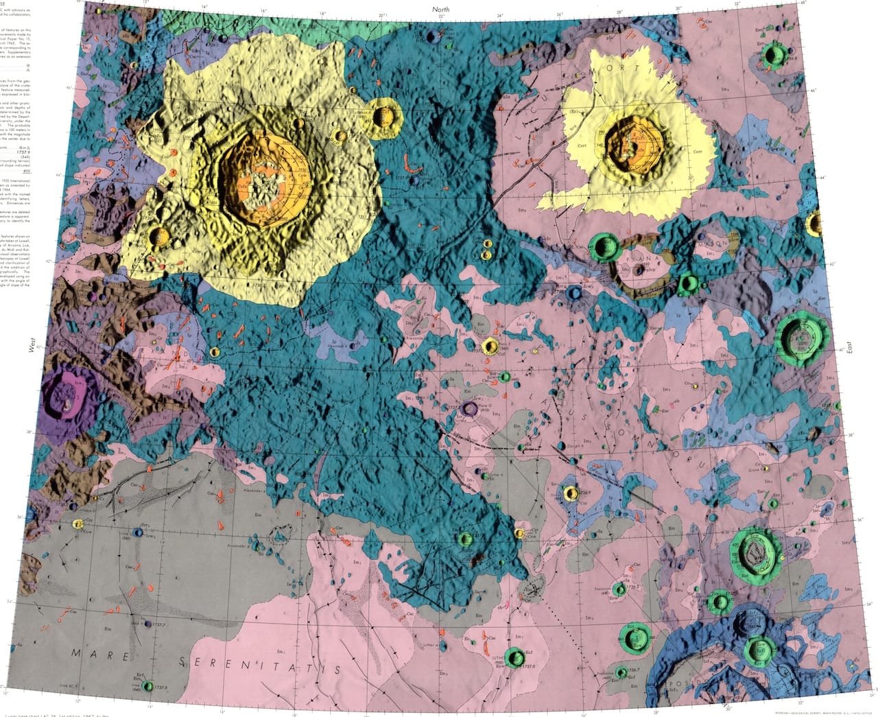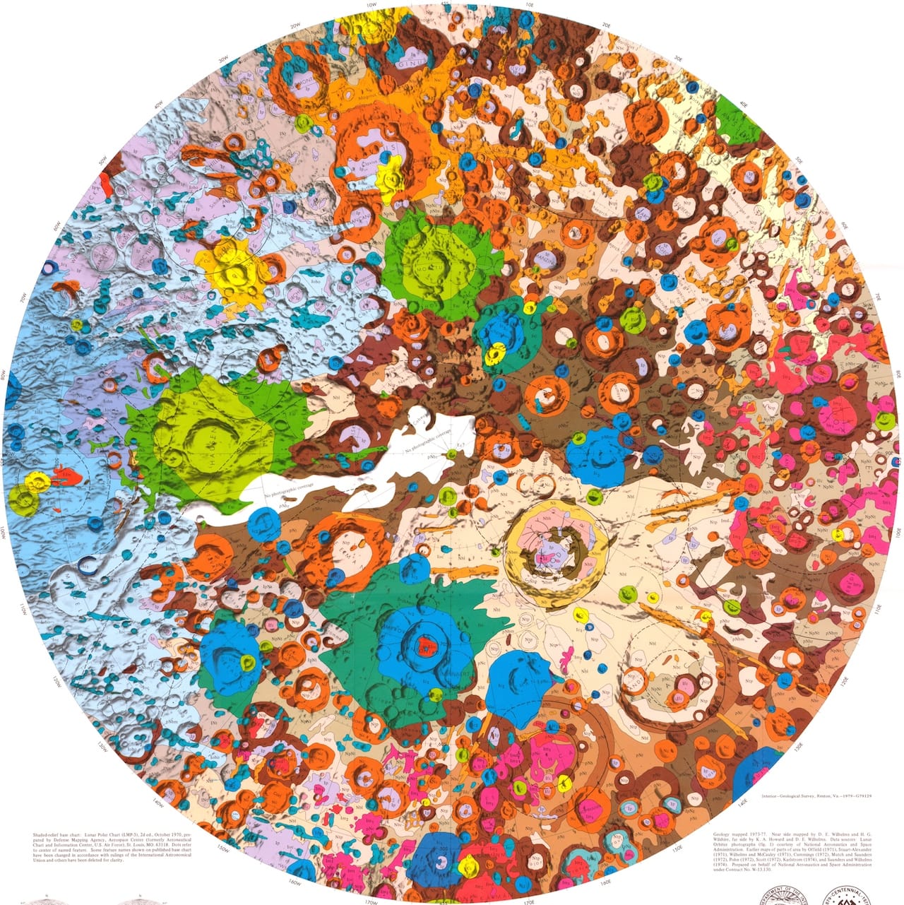 The geologic moon atlas maps use a color-coding scheme to refer to different types of terra, mare, crater, and other materials. Each image records a specific portion of the moon’s surface. The maps vary in scale from 1:5,0000 to 1:5,000,000, and some of the smaller ones function as zoomed-in versions of larger ones. All hail from the 1960s and 1970s, and their focus betrays the concerns of the era: six maps from 1970 portray the variety of landing sights considered for the Apollo moon landing of 1969.