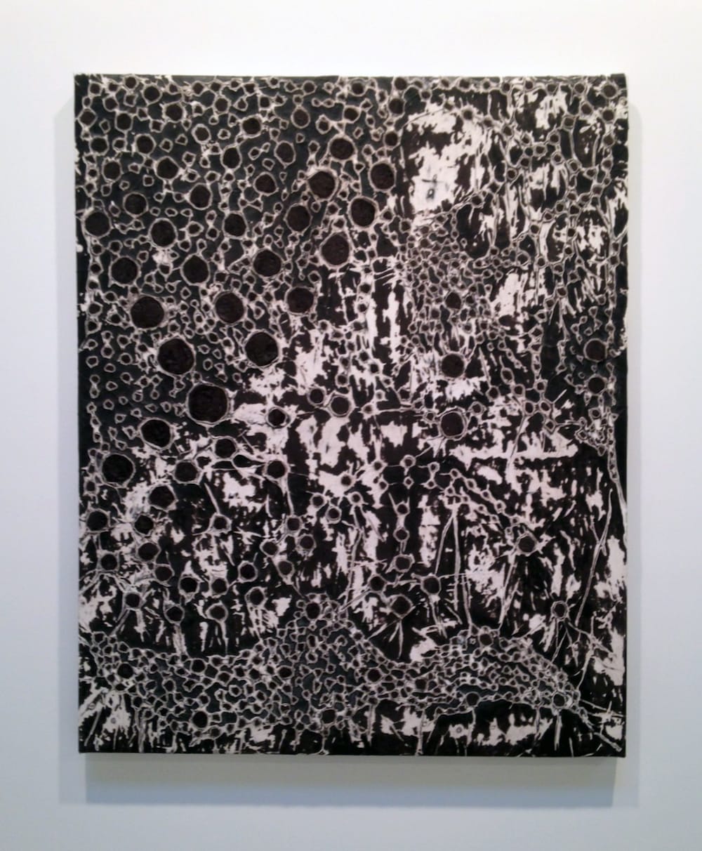 Another room holds exquisite smaller canvases (if you think of 5-by-4 feet as small) riddled with black spots, most against a white-ish ground, though there is one, the ravishingly graphic “Black and White” (2015), with a mostly black field that evokes a richly textured ebony moonscape. Bradford referred to the spots simply as “marks,” suggesting a primarily formalist/materialist intent, but, given the convulsive violence sweeping across domestic and international affairs, they struck me more as bullet holes than anything else.