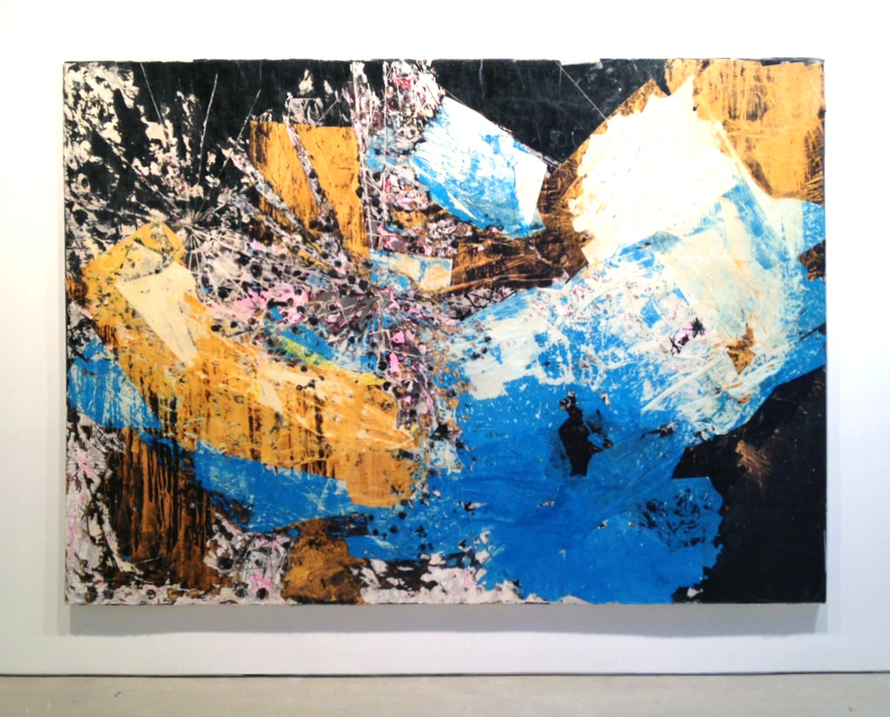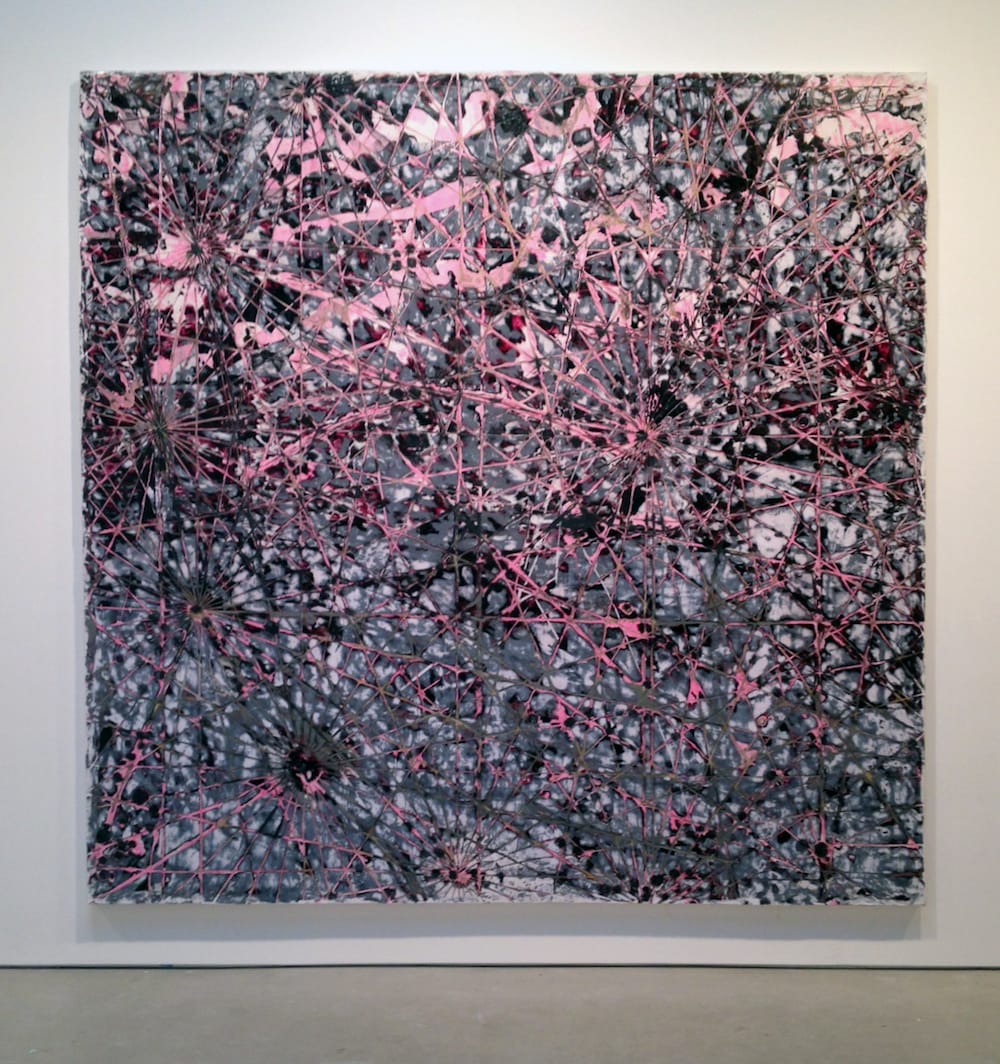 In the most stunning piece in the show, the 10-by-10-foot “Cigarettes and Bubble Gum” (2015), cross-crossing lines, many emanating from starburst shapes, are predominantly pink in the upper portion of the canvas, but change in the lower half into ragged and smeared layers of gray, lying above and beneath one another with a captivating illusion of three-dimensional space.