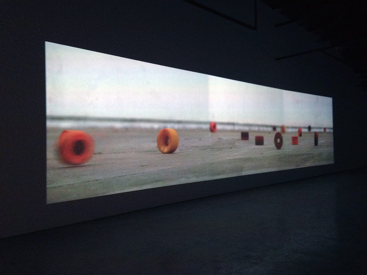 That would be a mistake. While the bulk of the exhibition, which is called Mark Bradford. Be Strong Boquan (after a line taken from a performance video that’s featured in the show), is composed of large abstract paintings, the first thing you encounter is “Deimos” (2015), a Cinemascope-scaled video projection depicting enormous orange wheels careening across an unspecified expanse to the beat of Sylvester’s 1978 disco anthem “Grateful.”