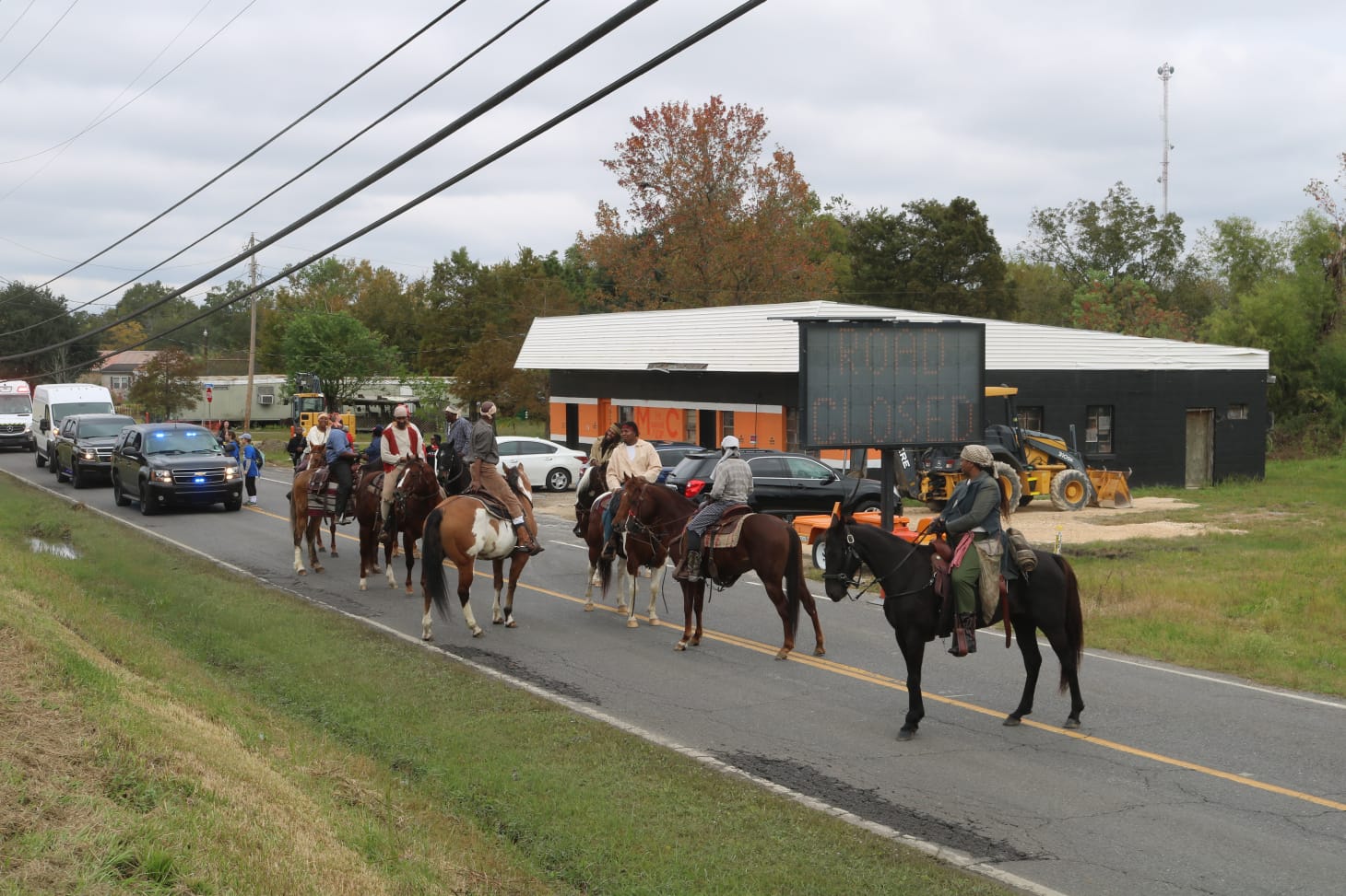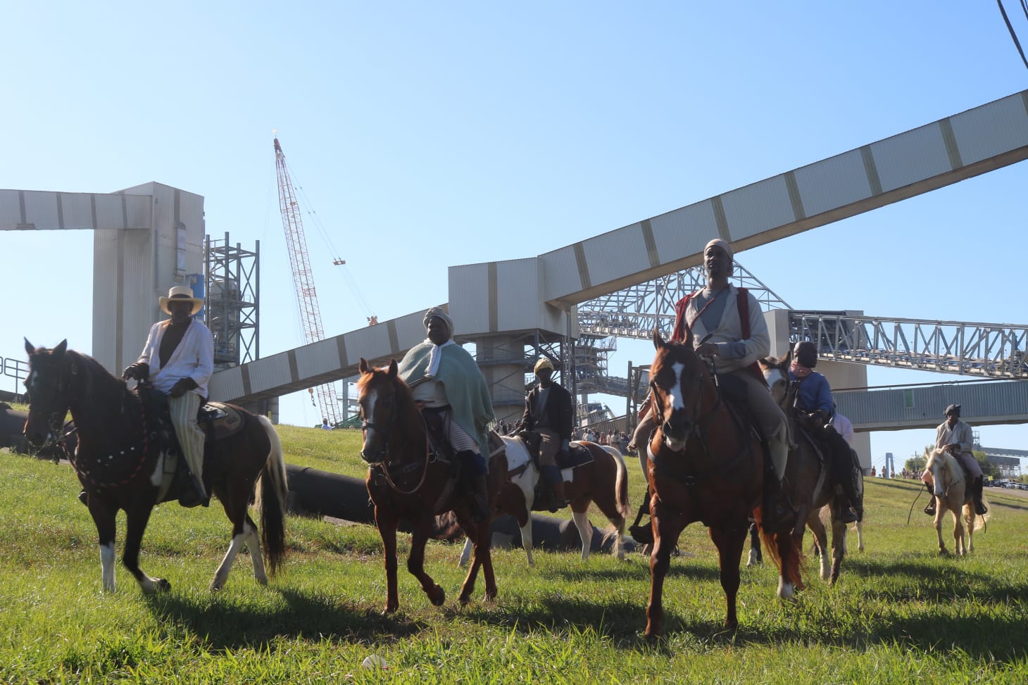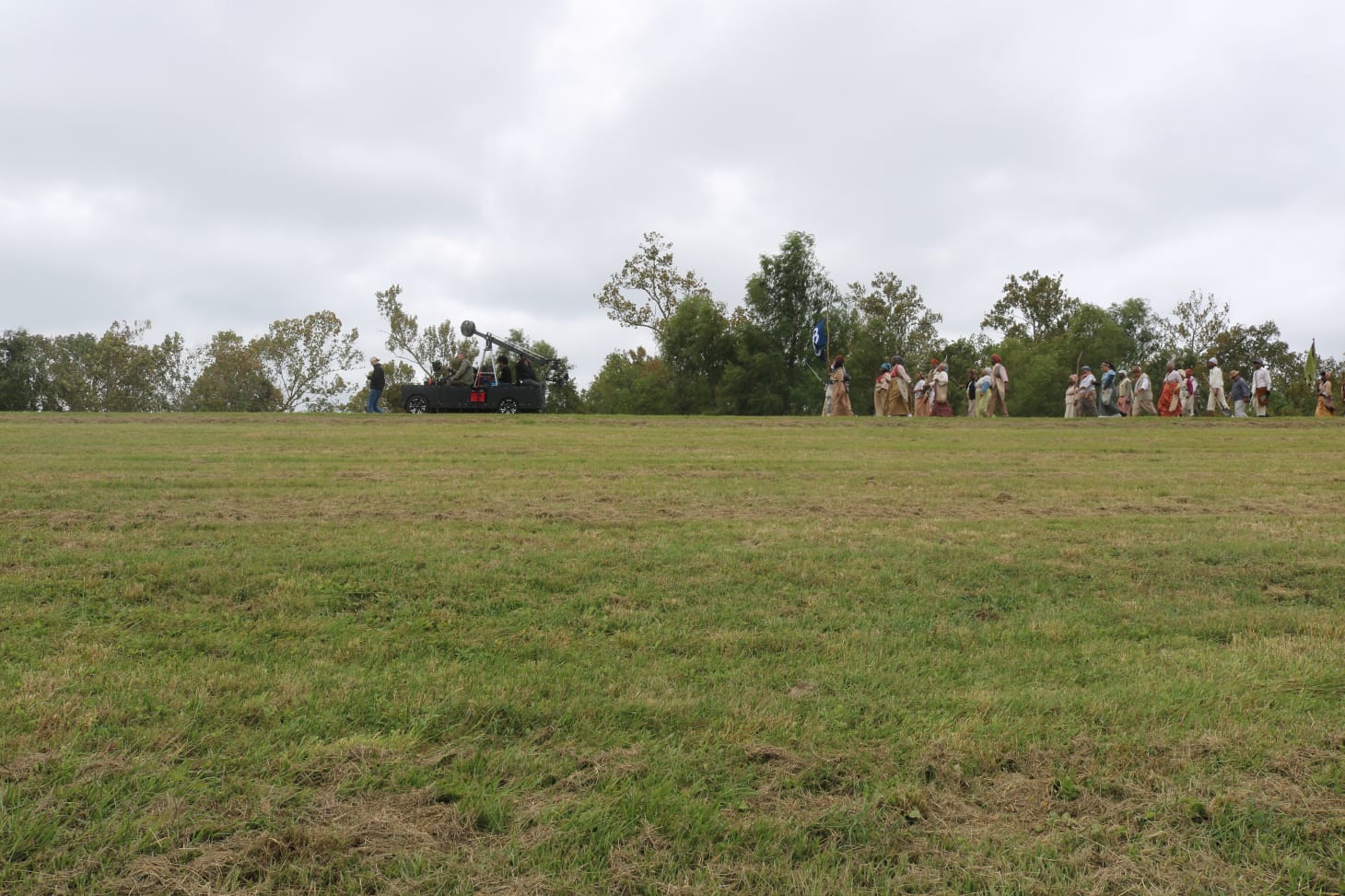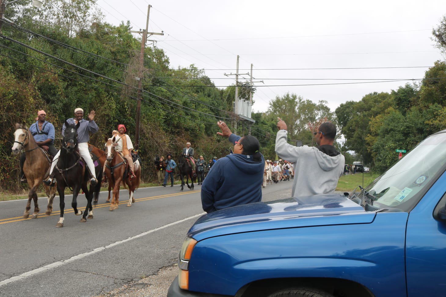 Starting in LaPlace, Louisiana, the march remained somewhat mysterious as it started. Press wandered aimlessly around a trailer park where they and some observers had parked, waiting for the reenactment to start. When it did, journalists scrambled to and fro hoping to catch the best shots of the reenactors. Filmmaker John Akomfrah, who’s documenting everything for a film installation, had his own production crew that often had to wrangle press out of their way. As a member of the press myself, these moments seemed to reveal that capturing this march in a certain cinematic quality was a top priority, that process unfolding right before those watching the reenactors pass by.