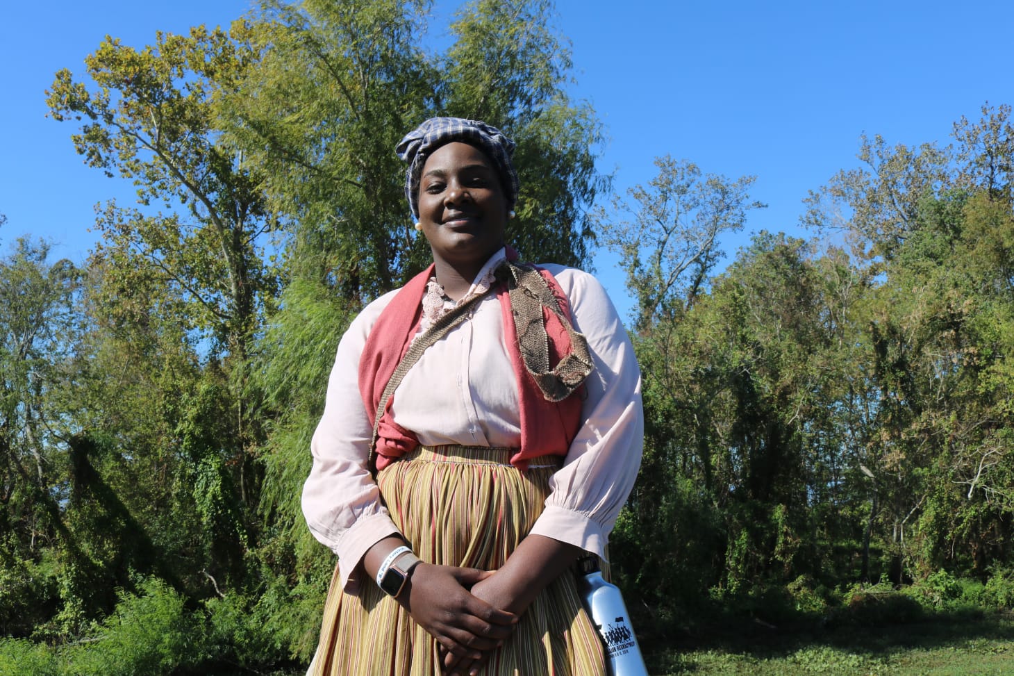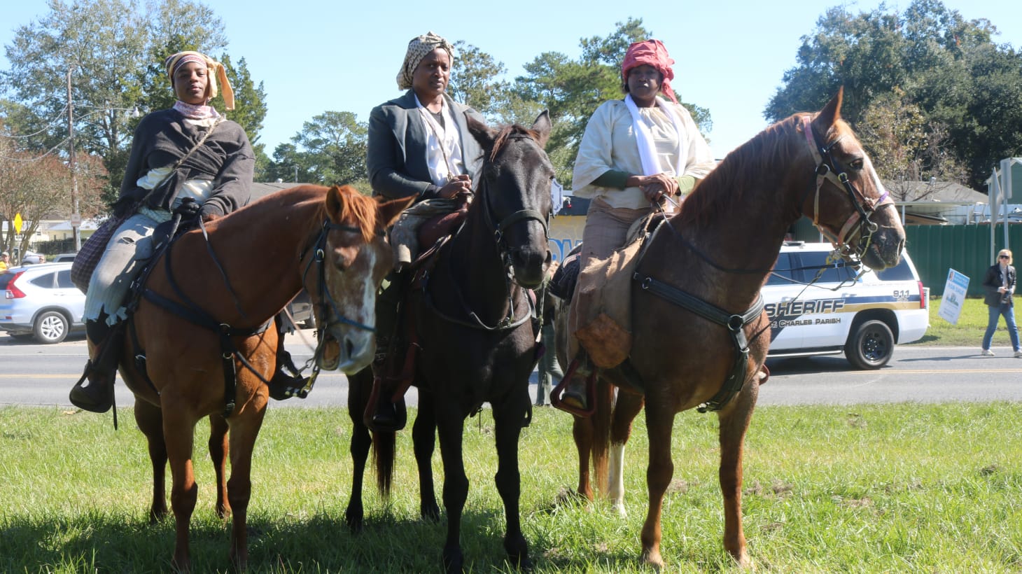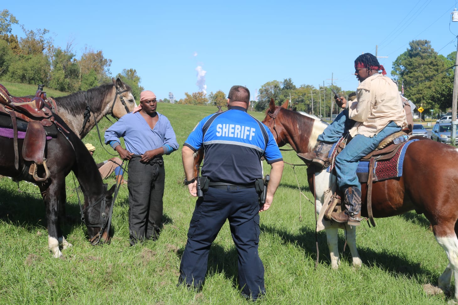 For miles, reenactors marched periodically, stopping on occasion to take breaks, passing small clusters of onlookers along their way. On narrow streets in small town Louisiana, this meant lots of traffic and congestion. As I walked (and ran) alongside the reenactment’s procession I stopped regularly to interview people. One Black woman pulled up next to me frustrated, and asked if we were filming “that stupid ass movie” that was preventing her from picking up her kids from school. She made it clear she had things to do in a way that brought reality back to the forefront.
