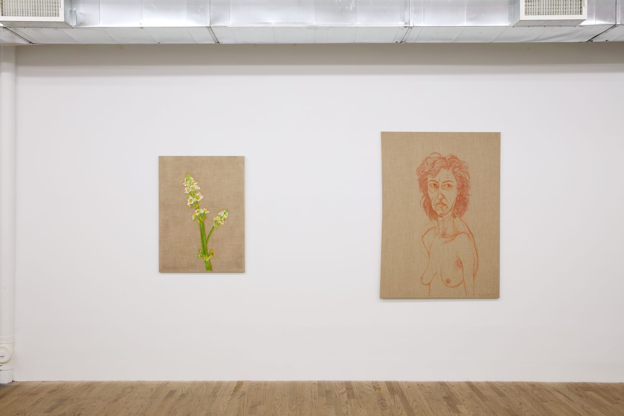 The intimacy of Schvartz's portraits, her interest in everyday people, and her multigenerational approach to representation require that viewers expand their understanding of what beauty can be; this is one of the artist's greatest achievements. Downstairs, a dainty, close-up painting of a tuberose flower has been placed next to a candid nude sepia drawing of Schvartz staring out from plain burlap, aged 55, as its title suggests; the juxtaposition speaks for itself.