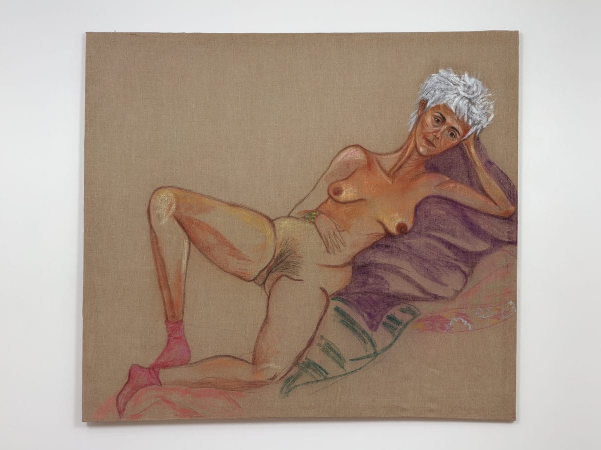 If grief and rage inform Schvartz’s work, the living color and energize it. Street performers, gay men, lovers, friends, and strangers from the Abasto, Once, and Constitución neighborhoods of Buenos Aires, whose very existence cut through the conservatism that lingered after years of state-sponsored repression, populate her paintings. Equally radical are Schvartz’s renderings of women— splayed, older, and unconcerned with or even bored by the male gaze, like the lounging protagonist of “Desnuda y con zoquetes” (2012).