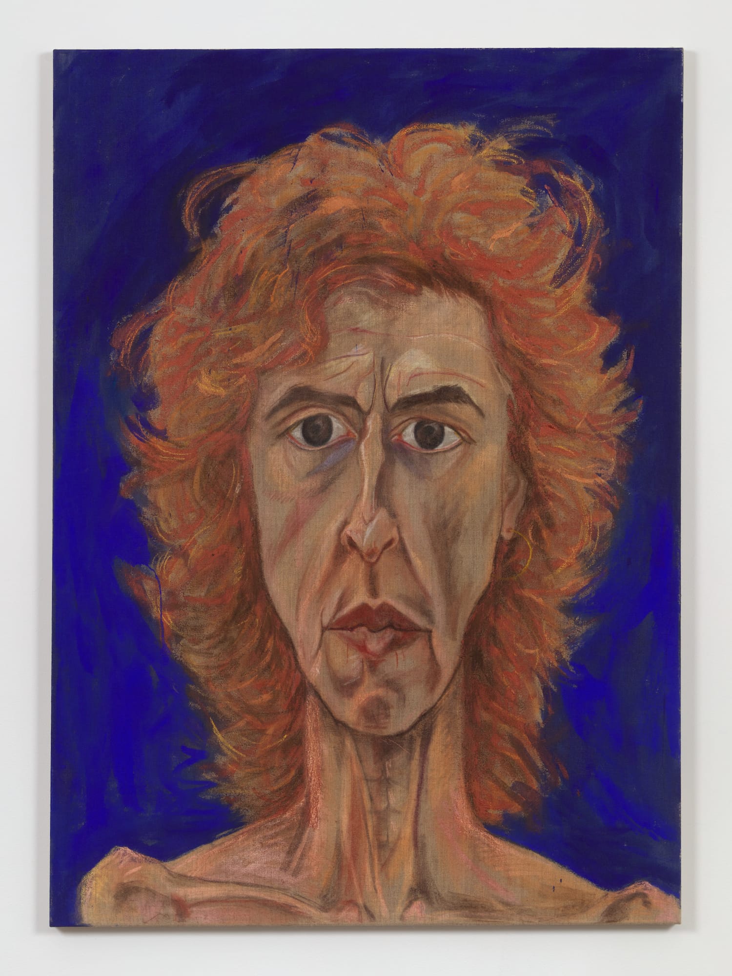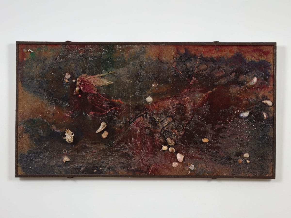 These threads run through Marcia Schvartz: Works, 1976–2018, the Argentine artist’s first US retrospective, curated by Amanda Schmitt at 55 Walker, a joint exhibition space of the Bortolami, Andrew Kreps, and Kaufmann Repetto galleries in Manhattan. A starkly frontal self-portrait of the artist, serious and orange-haired like a lioness, hangs prominently at the entrance to the first room. Titled “De cara al futuro” (2010) — roughly translated to “with my face to the future” — the painting looks resolutely forward while an adjacent piece, “Fondo L” (2008), turns to the past. The red-tinged horizontal panel, coated in an unknown gritty mixture, is set with seashells and animal skeletons culled from the Buenos Aires shores of the Río de la Plata, where many of the bodies of the desaparecidos — disappeared — were tossed during the “death flights” of Argentina’s Dirty War. The soft outline of a woman’s face is drawn as though with a stick in the sand, a gaping silhouette of loss.