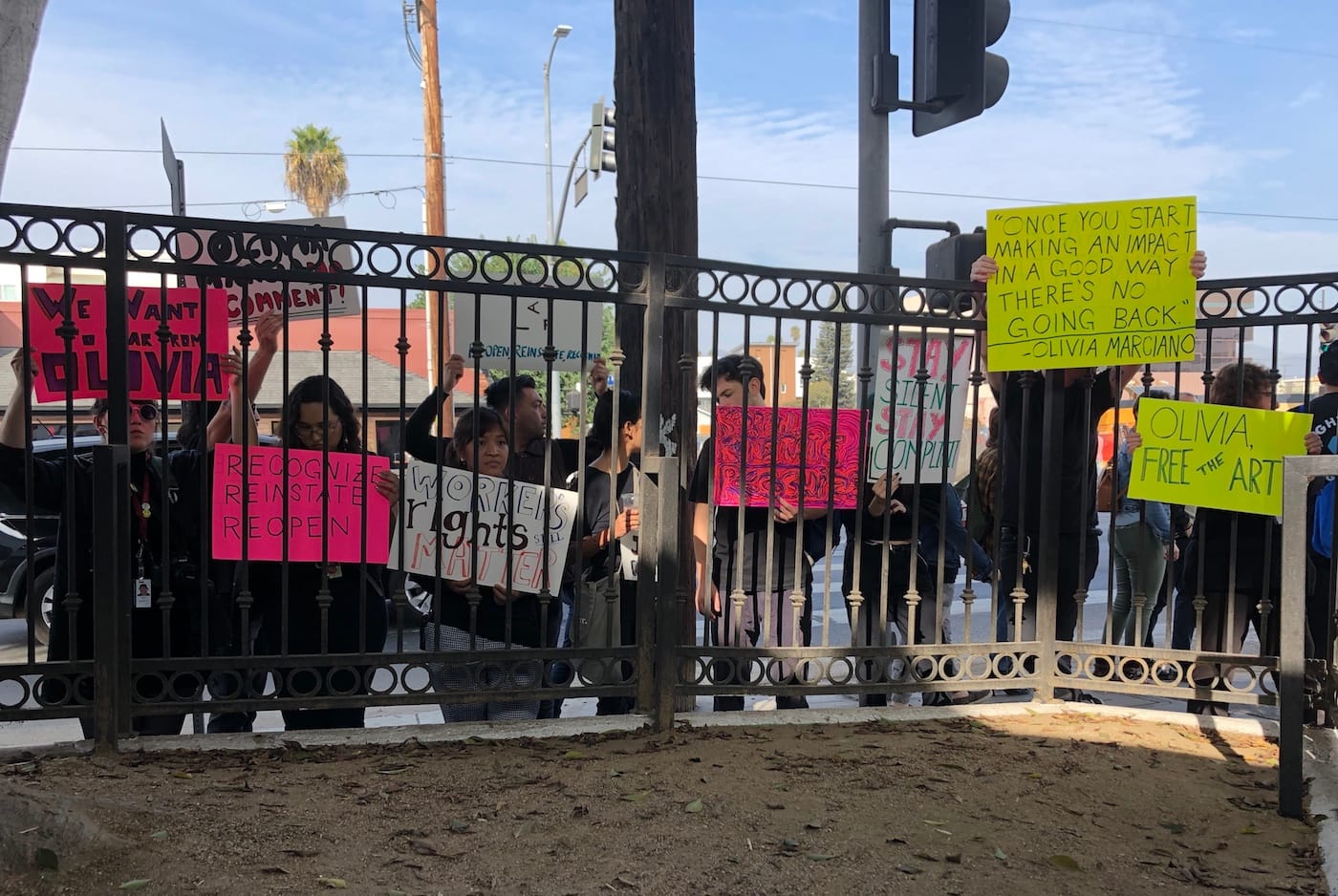 The action at LAXART was decidedly less boisterous than the protest at the Marciano last week, with only a handful of individuals entering the building’s courtyard, as others waited silently outside the gates, holding up signs. A rehearsal for a performance was taking place inside, so LAXART’s director Hamza Walker met the group in front of the building, where they presented him with a letter signed by AFSCME District Council 36 Executive Director Cliff Kerce outlining recent events and describing why they were now focusing their attention on Olivia Marciano and LAXART.