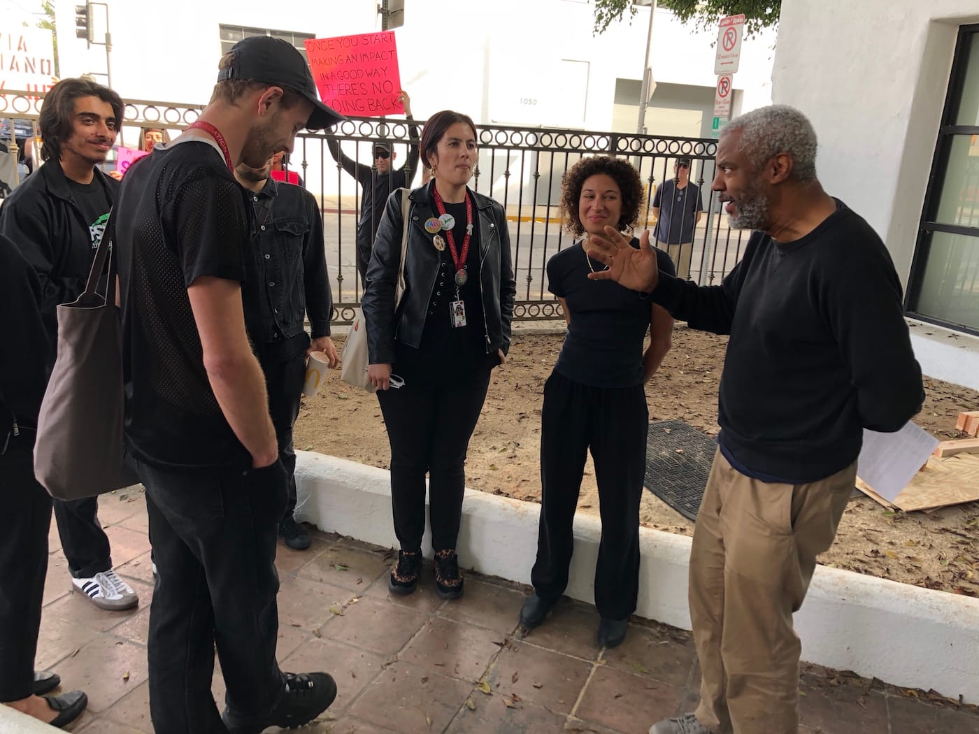 “I take it to heart that they showed up,” he told Hyperallergic and a reporter for the Los Angeles Times after the former Marciano workers had left. “I value having had a chance to have an exchange with them.”