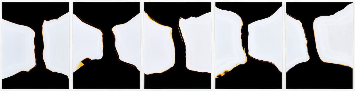 The cropped shape recurs and changes. In the works in which the shapes are black, I began thinking of the white shapes as ice floes on a black sea (or oil slick). Is it because we are living in weird times, thinking about the impending apocalypse, that Breuer’s work stirs up gloomy associations? That it can come across as both the aftermath of one event and the prophecy of another is just one of its many strengths. Moreover, the scratched surfaces evoke the artist’s hand, as well as the labor involved. When a row of them is placed close together, you might be reminded of an action sequence in a film. The liquid shapes underscore the inevitability of change.