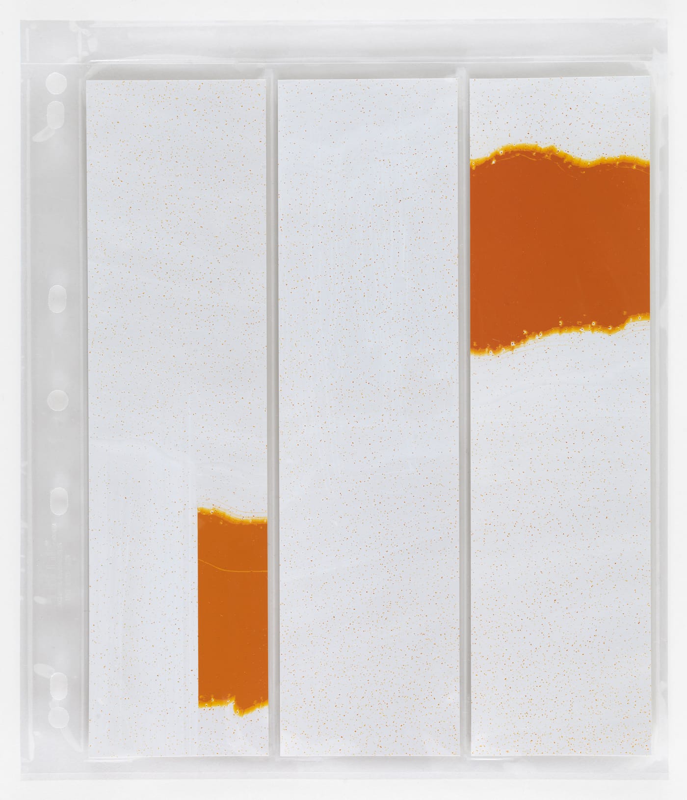 Breuer has been making abstract photographs since the early 1990s. However, in contrast to Aaron Siskind, whose black-and-white photographs of walls were linked to the gestural paintings of the Abstract Expressionists, particularly those of his friend Franz Kline, Breuer works with sheets of chromogenic paper, which, as the label for “Untitled (C-1773)” (2016) informs us, has been “exposed/embossed/scraped.” Ordinarily when it comes to photographs, we tend to look at the image and ignore the surface. With the work in this exhibition — flowing, monochromatic shapes surrounded by a white field – I found my attention drifting between surface and image, becoming aware of the photograph as an object, a thing: a point Breuer has underscored by framing a plastic sleeve containing three vertical strips.