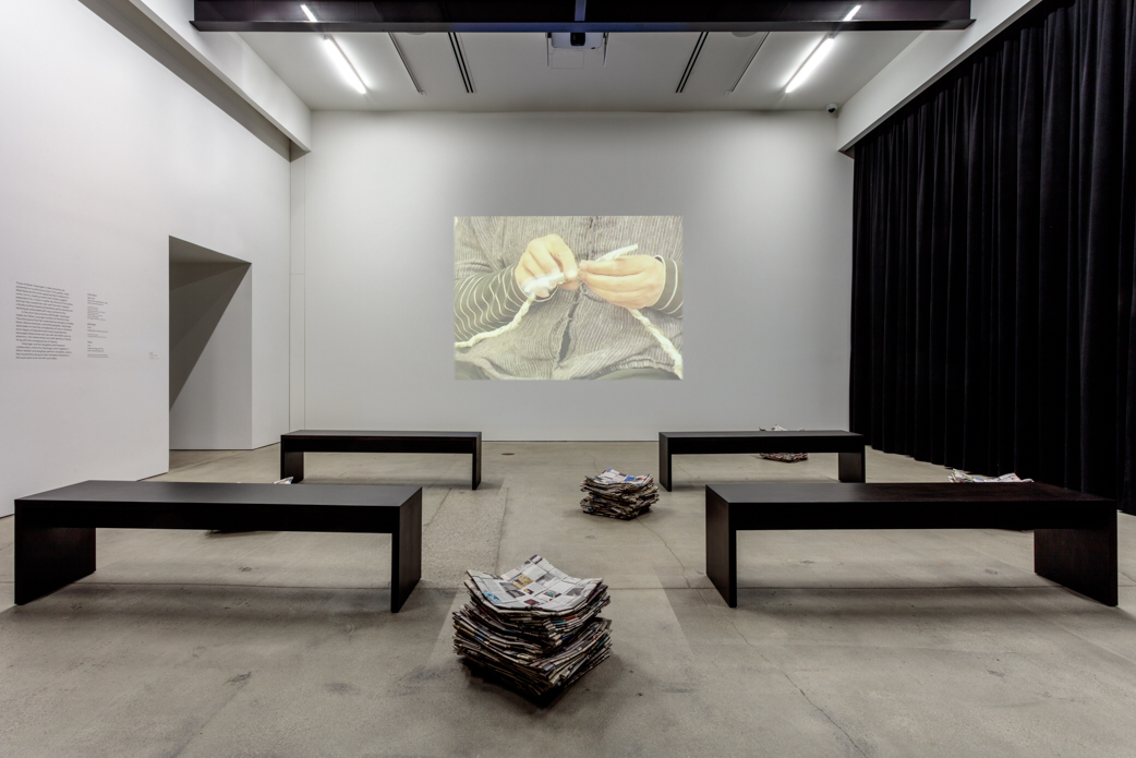 Interspersed between the video’s interview clips are close crops of Hassinger’s hands as she twists strips of torn newspaper. For her, the act of moving forward manifests in this cathartic, meditative manipulation of paper. In “Birthright,” the strips are a proxy for the bits of information she gathered from her uncle, and as she twists them together we see her begin to transform the information into something new.