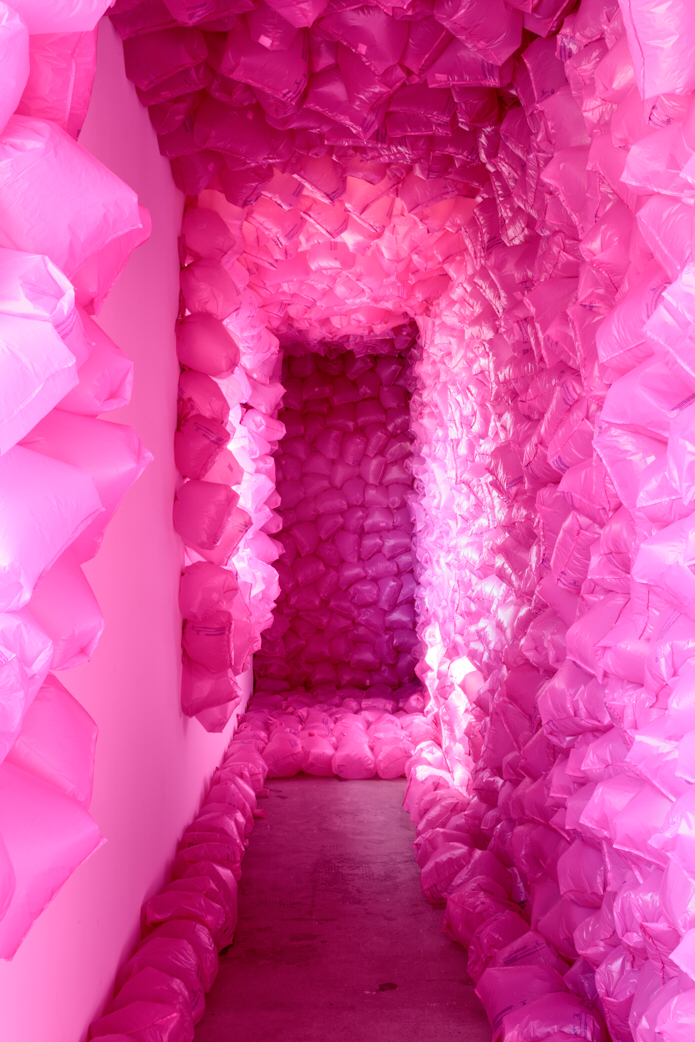 In The Spirit of Things, Hassinger returns to the plastic bags in a poetic installation that alludes to the emotional journeys of “Birthright” and “Wrenching News.” A short, narrow corridor at the entrance of the gallery is lined with hundreds of the bright, pink bags, each filled with air and a single love note. Collectively they deliver a potent reminder about what’s possible when we find the space to heal and move forward.