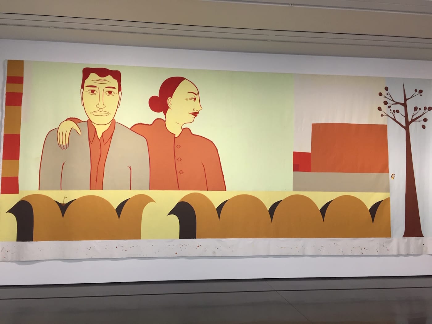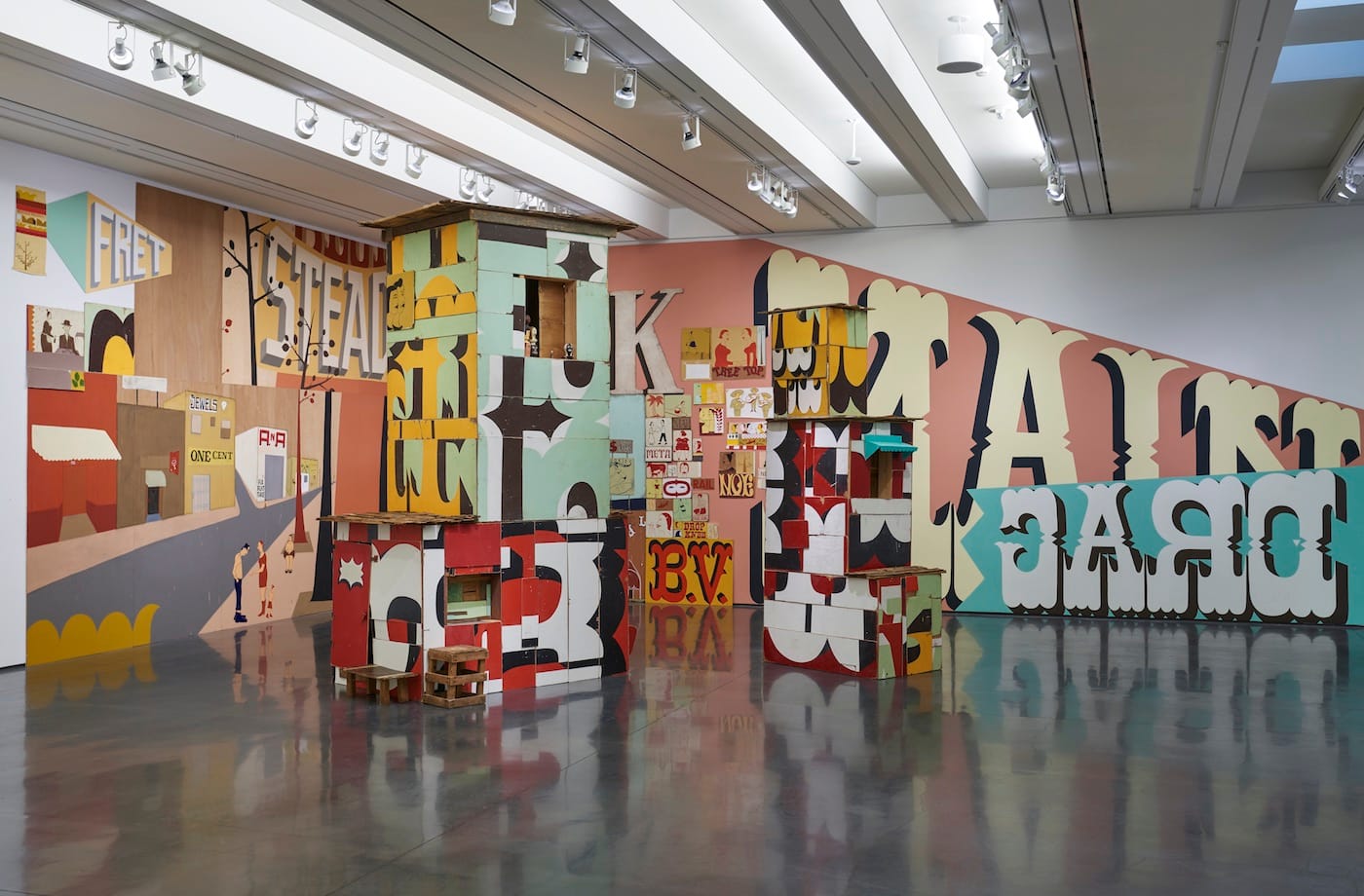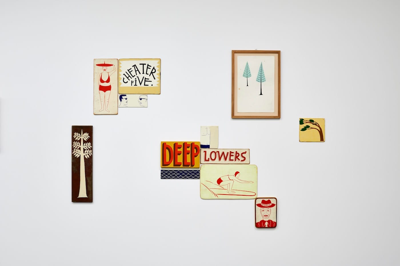 Margaret Kilgallen: that’s where the beauty is, at the Aspen Art Museum, is the artist’s first posthumous museum exhibition and the largest presentation of her work since the 2005 show titled In The Sweet Bye & Bye at REDCAT in Los Angeles. The reuniting of this large body of work feels like several streams converging into a river and spilling over its banks. It is overwhelming, but it is illuminating to see how the artist’s understanding of typography, gained from years as a book conservator and a degree in printmaking, mesh with stories and figures — for instance, in the serif-like rooting of her tree trunks. Most importantly, the exhibition is a significant engagement with and documentation of her visual lexicon and isolated gestures.
