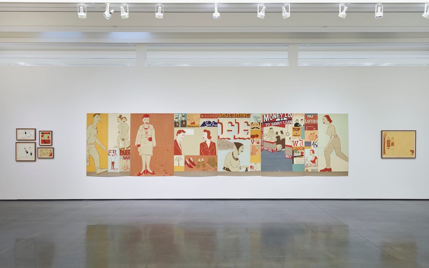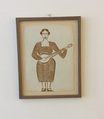 These women are like Greek goddesses, not physically unique, but each one subtly signaling her story with a pose or tool. For example, the name Fanny, all in caps, rests near images of a swimmer that recall Australian 1912 Olympic champion Sarah “Fanny” Durack who went on to break 12 world records in 6 years, all in a wool bathing suit. The incredible 1940s banjo musician Matokie Slaughter, whose image didn’t make the covers of the albums she was featured on, is portrayed as a female figure holding a banjo. May Rindge lost her Malibu land rights to the construction of the Pacific Coast Highway in a 1923 Supreme Court ruling. She eventually developed and sold 22 miles of ocean front on her own, only to lose it all in the 1929 stock crash. Rindge is shown here as a woman holding a rifle. Kilgallen’s figures are always presented in a public setting, so the gaze is never voyeuristic. We see what the women allow us to see.