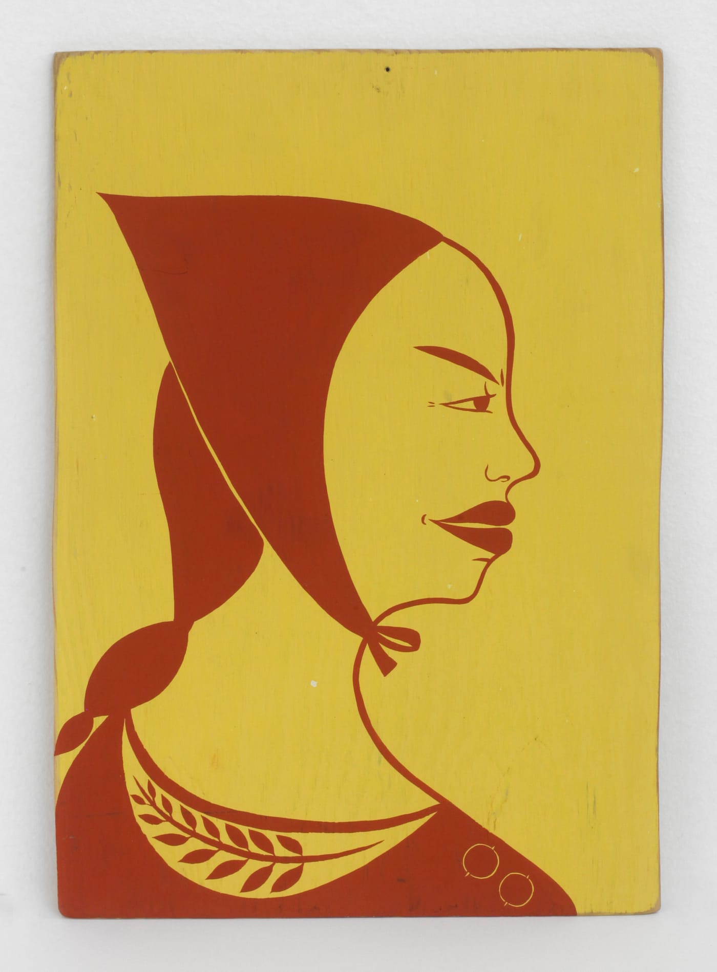 Many critics are tempted to describe Kilgallen’s work as nostalgic, but her style does not fall into any one period. The color scheme represents one period and her fonts, whether bold and commercial or kitschy — the latter recalling, say, a carnival in a frontier town — represent another. Nostalgia also implies a selective memory, scrubbed of the negative, which is not what is happening in the artist’s work. Nowhere is this more evident than her constant return to the female figure. The prominent dark lips, lunging posture, columnar bodies, and a blanket of hair are constructed from refined lines that cut through the weathered and worn spaces where she originally created the artworks. The trailing point of a scarf that swoops around a head and fastens under the chin echoes the tips of leaves on a bowing branch, which itself recalls the bend of brow line. While her text drifts and tangles, the woman as narrator remains steadfast.