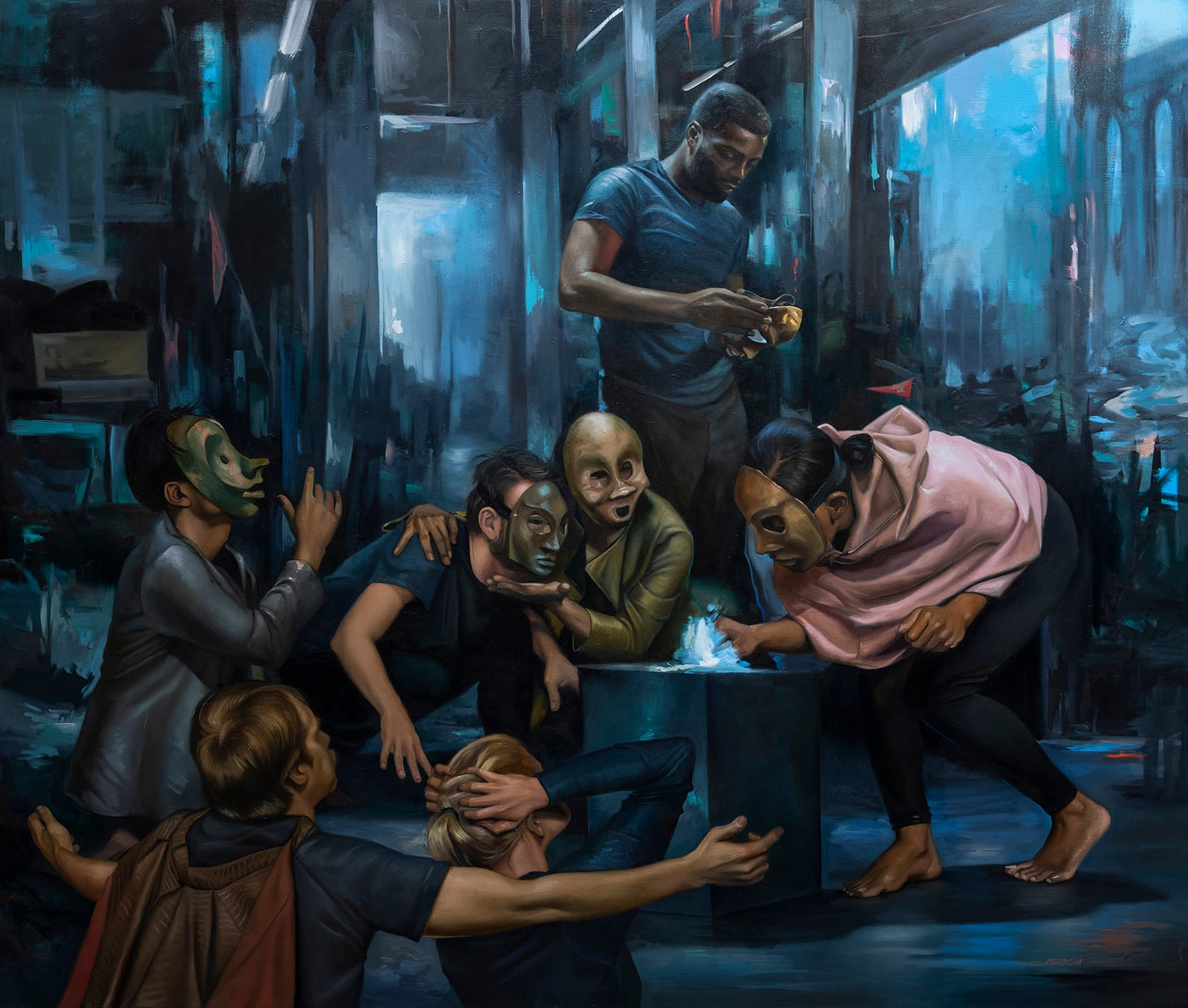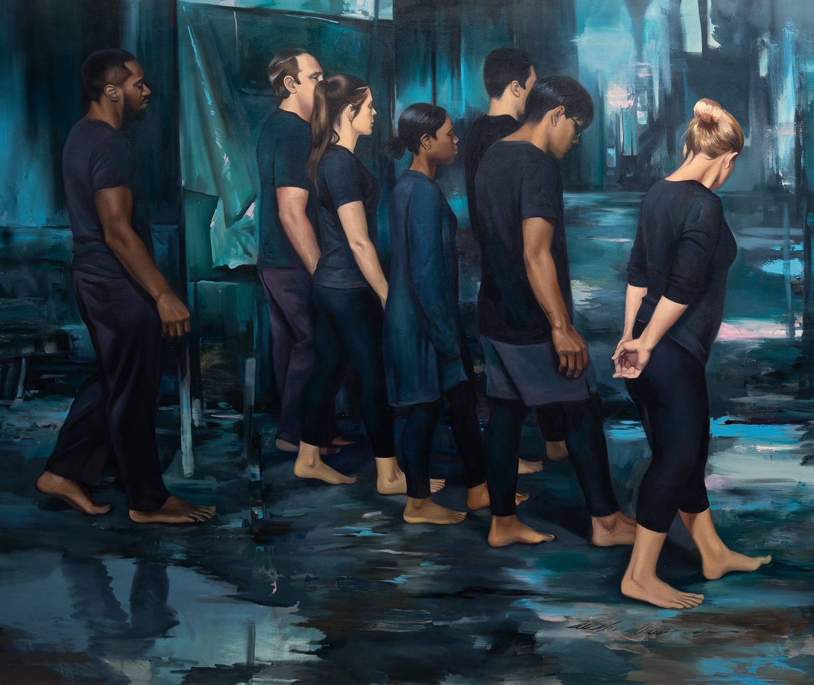 In 2017, Professor Margaret Morrison proposed a Faculty Research Grant to the University of Georgia’s (UGA) Willson Center for the project “Contemporary Examination of Caravaggio’s Dramatic Staging and Lighting - A Collaboration between Painting and Theatre.” She worked with Professor Anthony Marotta of the UGA Department of Theatre and Film Studies to explore various methods of stage choreography for the purpose of photographing and collecting reference images. She created a script for UGA theater students that resulted in a stage performance directed by Marotta and documented by photographer Gabrielle Rosenthal. The collaboration provided Morrison with reference material for Paradigm Shift, through which she reflects on enlightenment and her personal experiences with faith and spirituality.