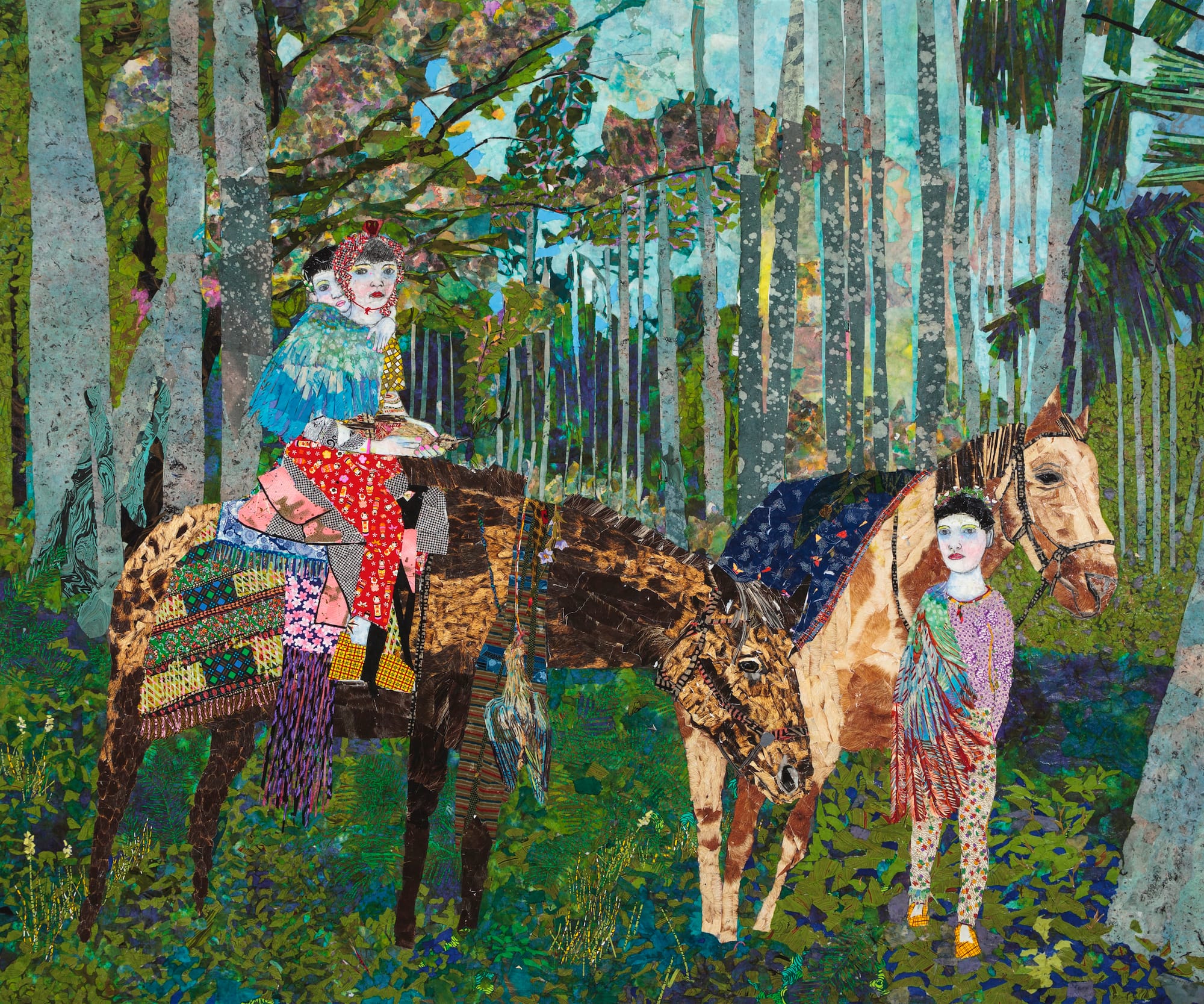 WEST PALM BEACH, FL — When I arrive at the Norton Museum of Art to visit Esperando Mientras la Noche Florece (Waiting for the Night to Bloom), the first survey of María Berrío’s enthralling oeuvre, I am beaming with expectation. The Brooklyn-based Colombian artist has made a name for herself by building meticulously crafted collages into gargantuan canvases, using watercolor and decorative papers primarily sourced from a master artisan in Osaka, Japan, as well as various places in Latin America and other parts of Asia. Women, narratives of displacement, and ecology play a central role in Berrío’s striking compositions, which are very much inspired by Latin American magical realism.