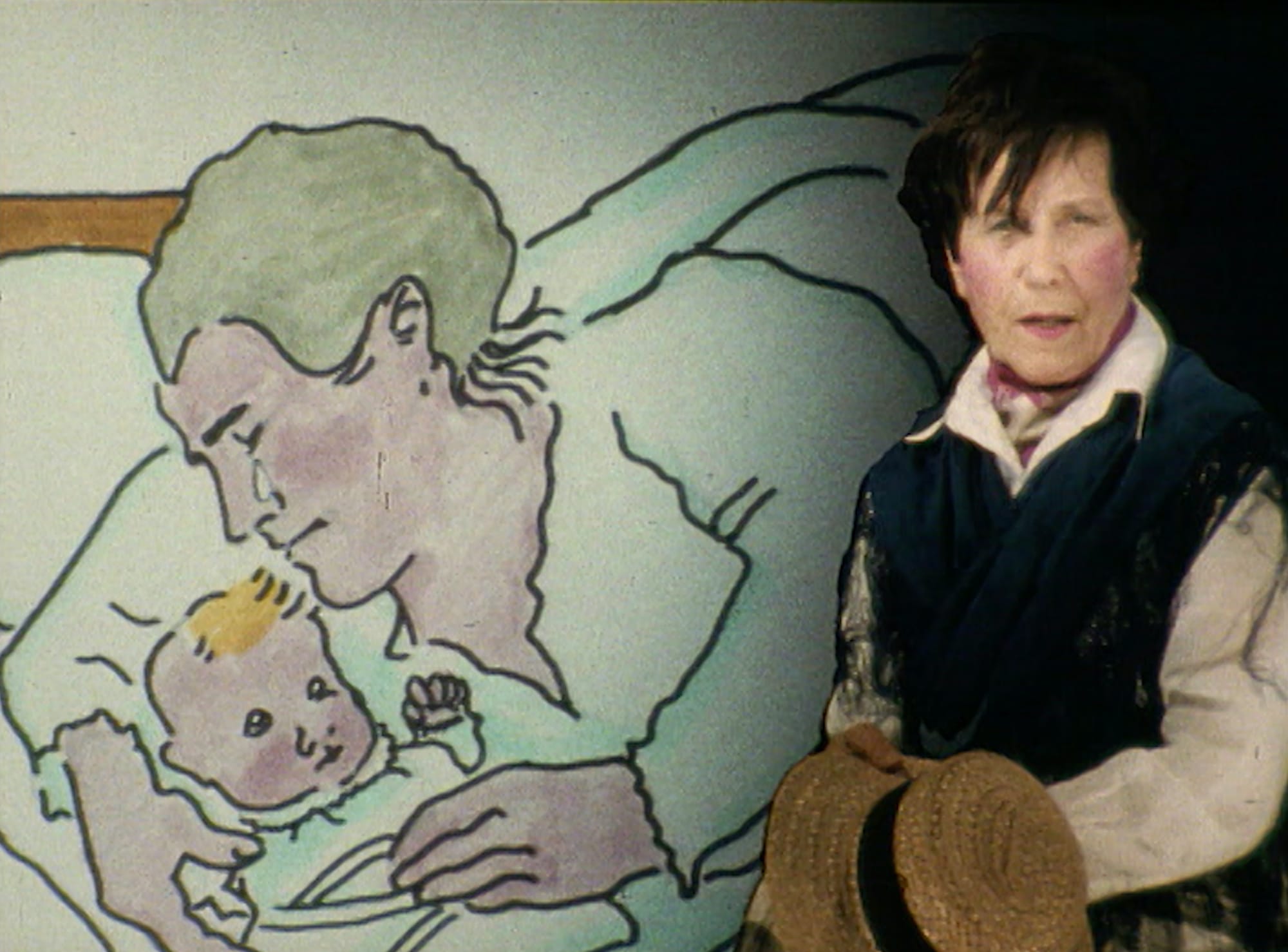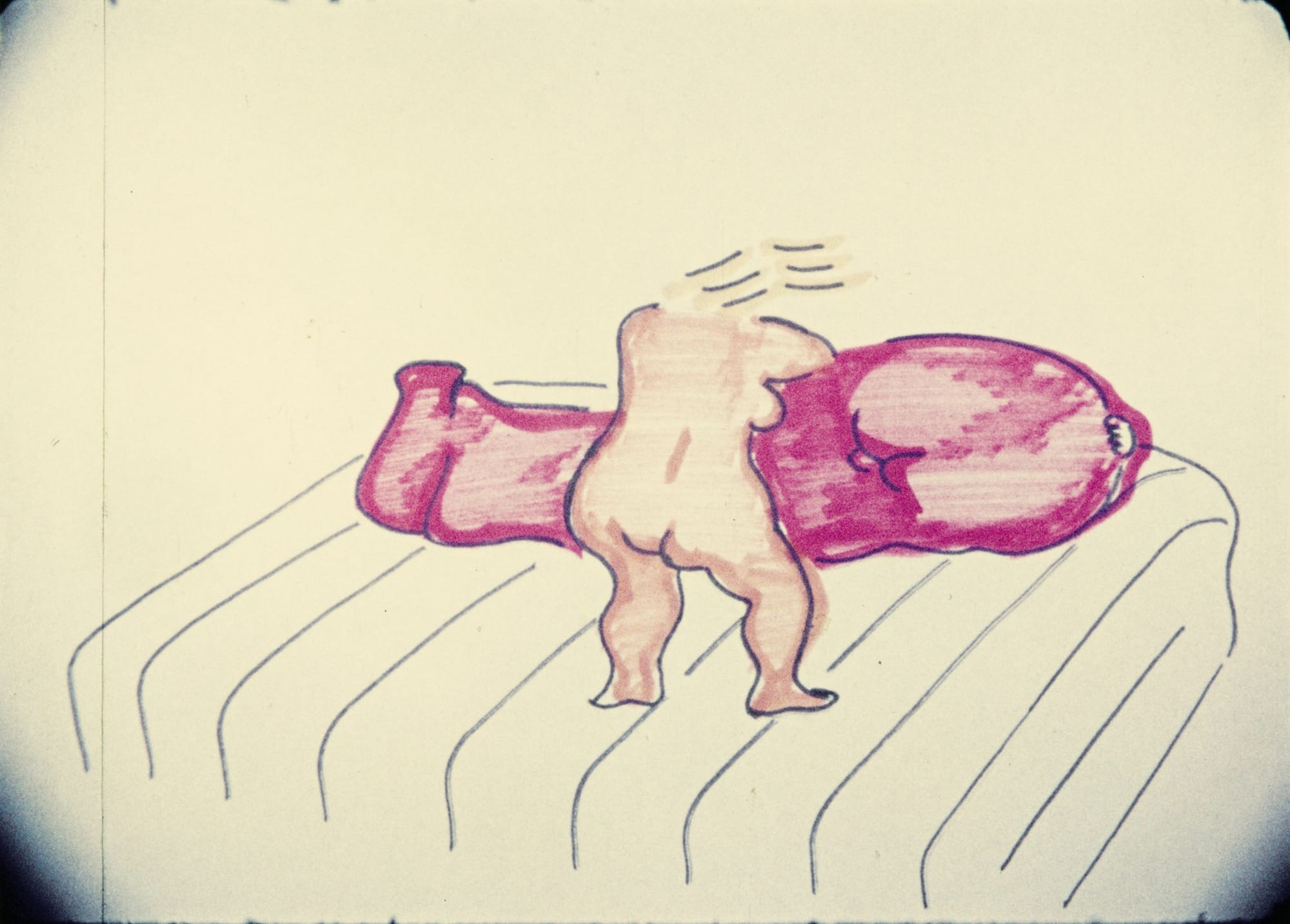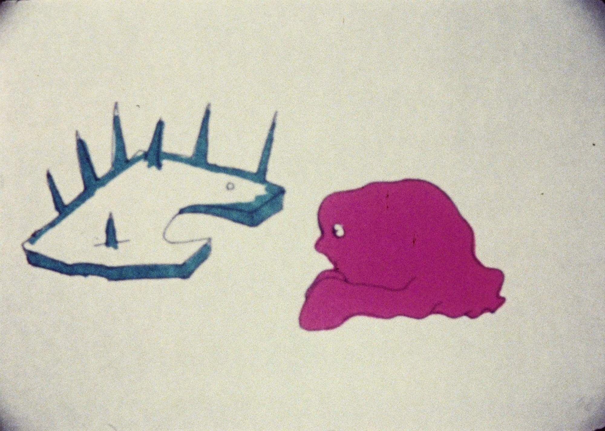 As Lassnig says in the voiceover for "Selfportrait" (1971), she was “depressed, not suppressed.” The film’s rhymed ditty, “stamped, I didn’t mind / strangled, I didn’t mind / I still love mankind, but I am tired” perhaps best expresses her flinty spirit. The film also speaks to the power of simple gestures: As she evokes death, “until you will be gone with the wind,” the self-portrait that she’s animated on paper suddenly disintegrates. The tiny lines that filled in the contour of her face fly off en masse, as if blown by a cruel gust, contorting her visage until she’s no more than a series of horizontal lines. Her perfect fusion of figure and line, pushing past the limits of logic, creates novel forms. Her “little films” are a triumph.