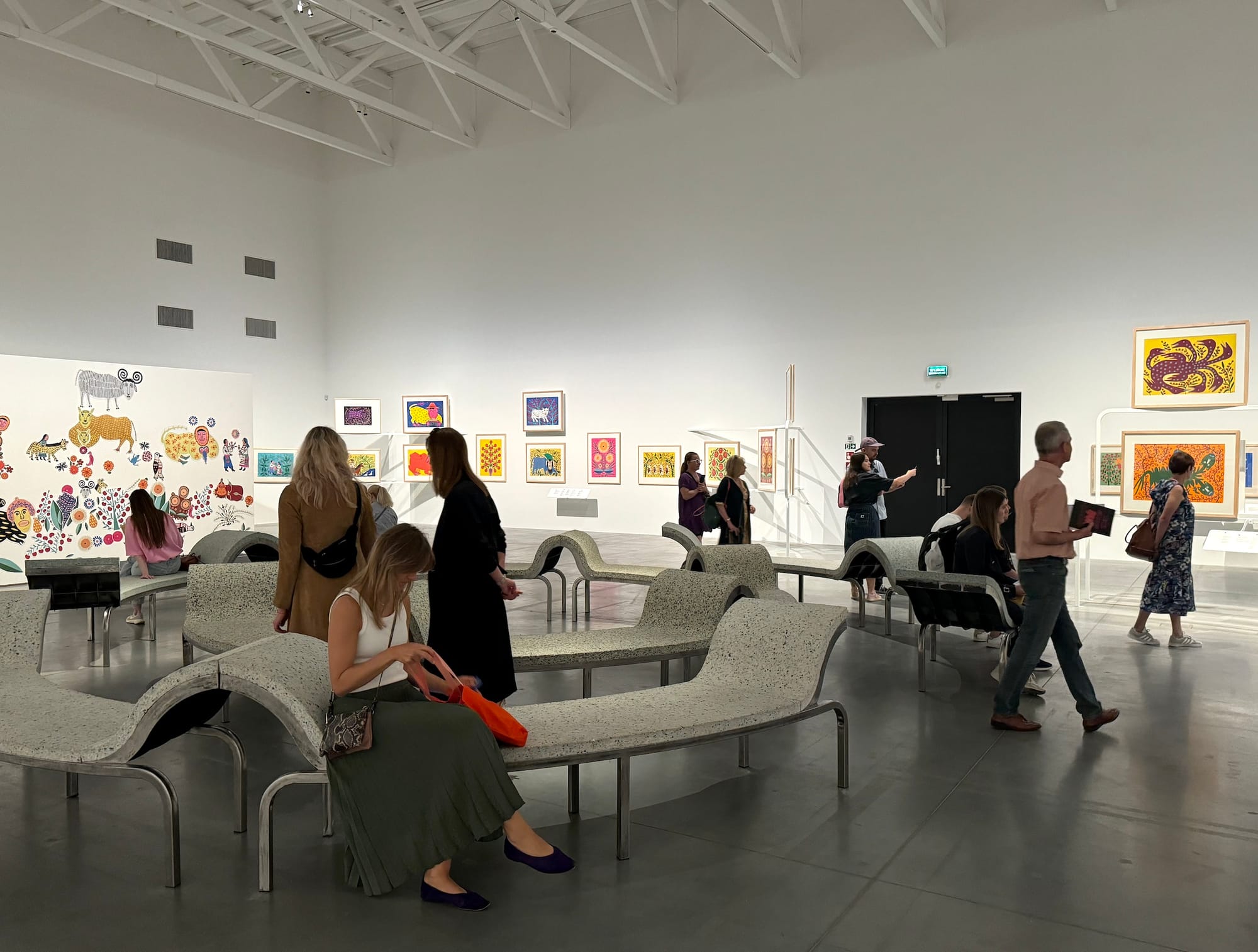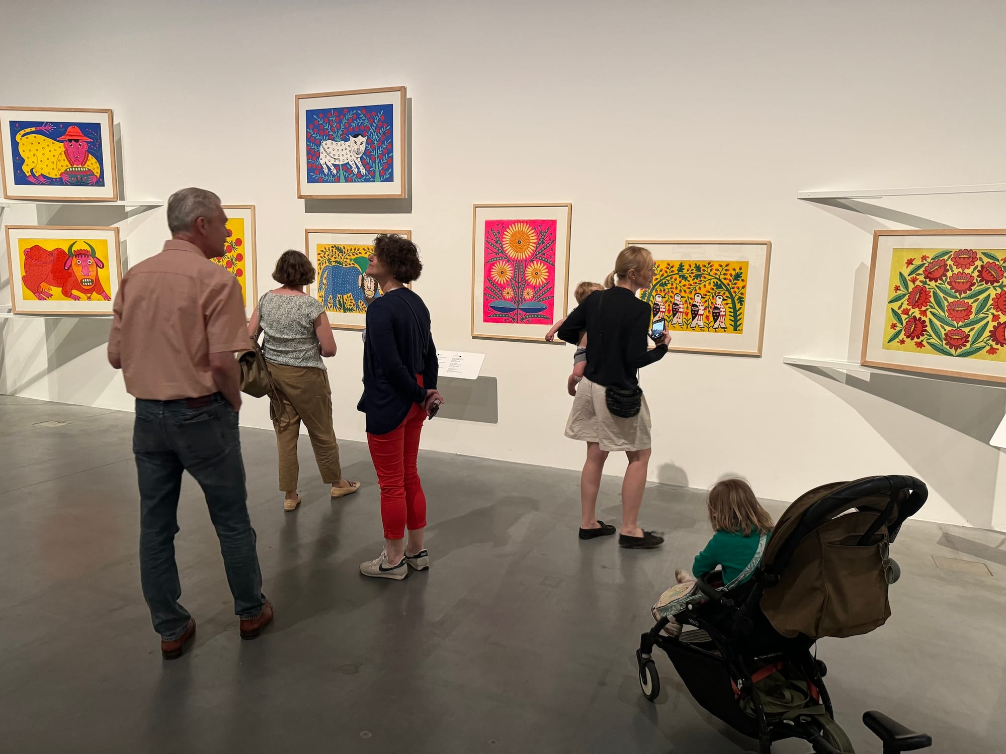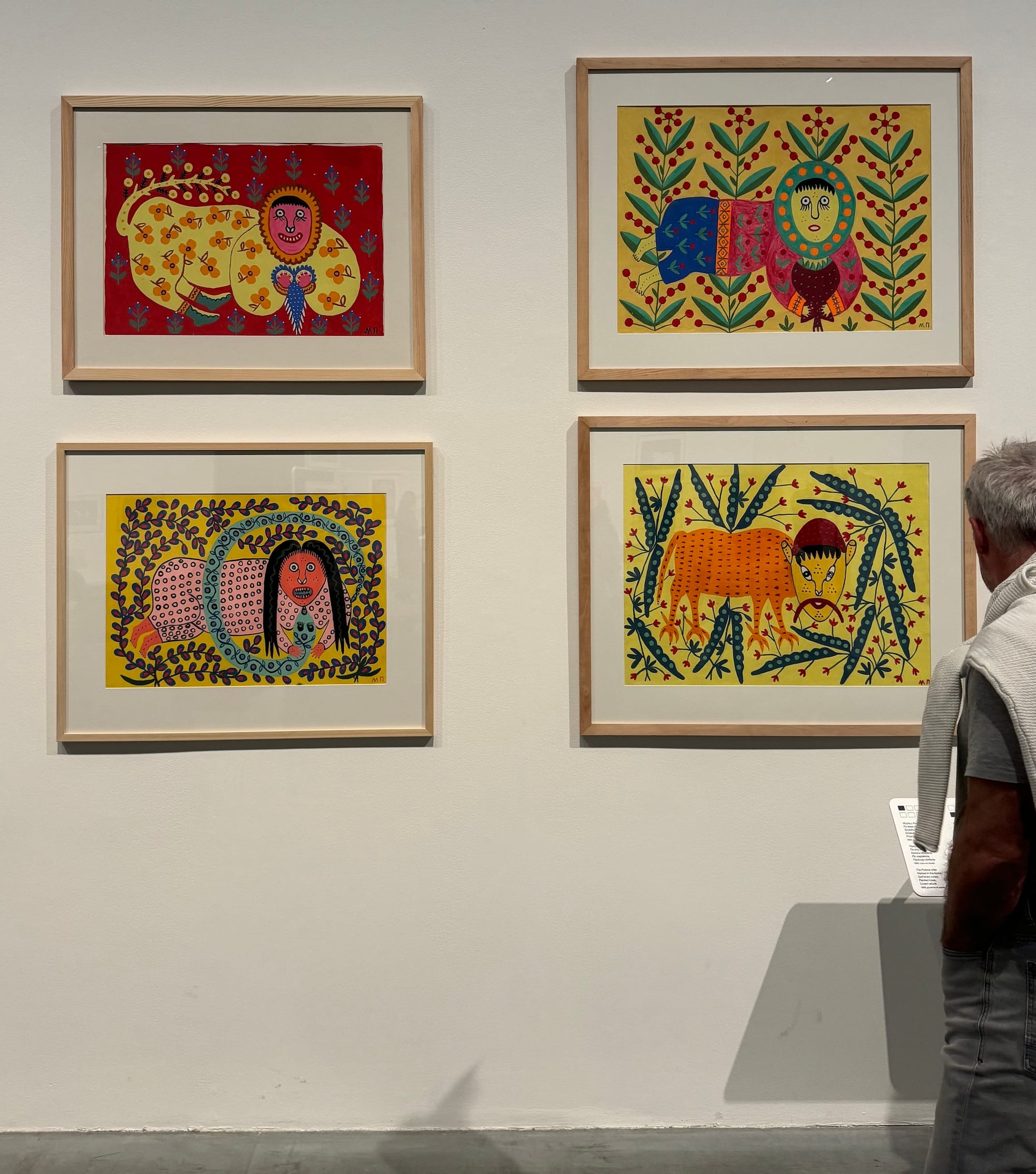 WARSAW — Walking into A Tiger came into the Garden: Art of Maria Prymachenko at the Museum of Modern Art in Warsaw feels like entering a kaleidoscope. Hanging salon-style and on a circular display system designed specifically for the exhibition, the paintings — often depicting anthropomorphized animals — appear to be floating, encouraging us to wander in a dreamlike, nonlinear fashion. Curved benches with headrests arranged in the center of the room invite not only prolonged viewing but also rest, reflection, and play. During my visit, a mother breastfed her baby while children ambled nearby.