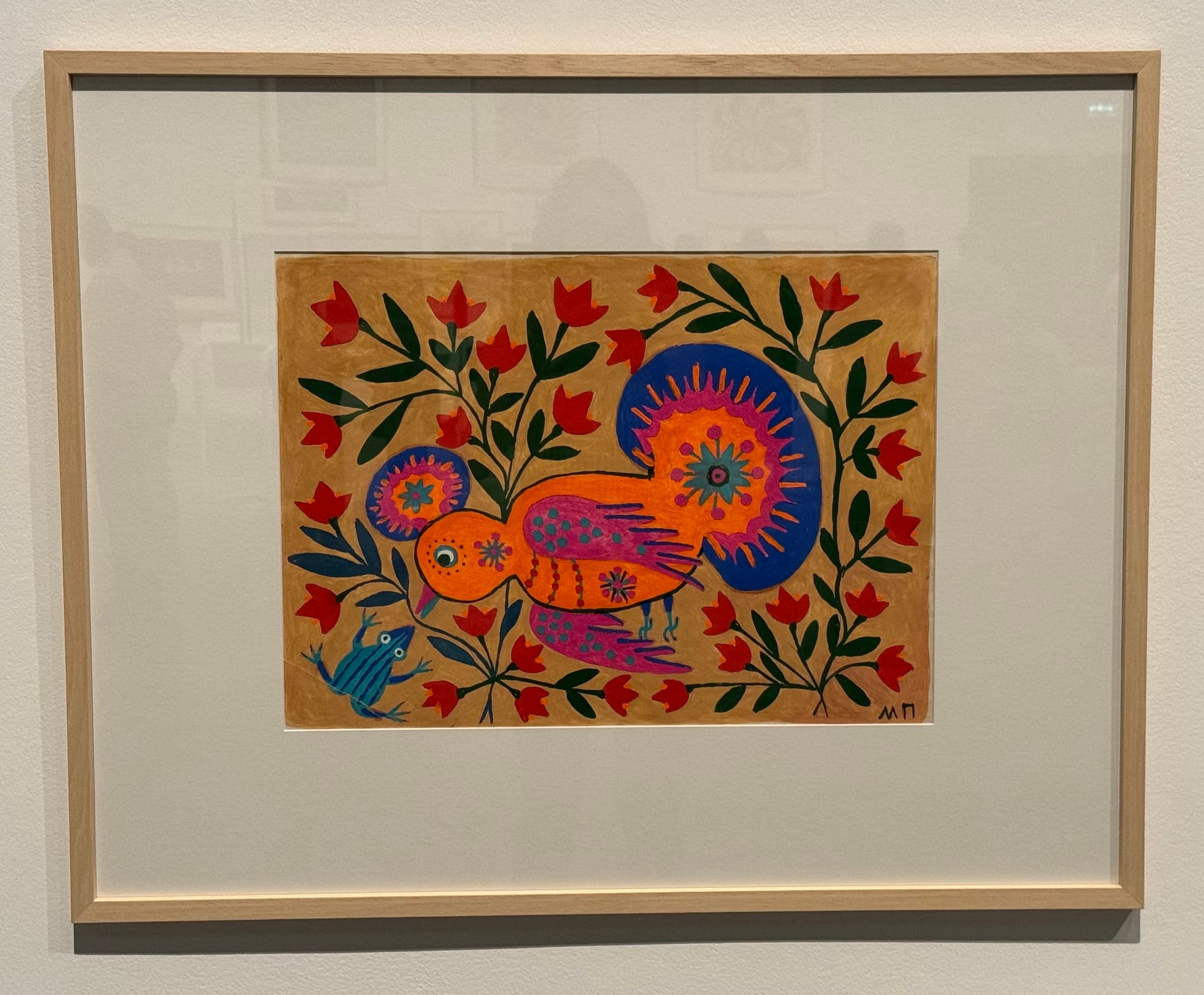 If not for the wall text, labels, and guided tours occasionally passing through in Polish, English, and Ukrainian, it would be easy to forget the exhibition is in a museum and not a play and rest area for children and adults alike. This is the first major show in Poland of the late Ukrainian artist Maria Prymachenko, and its curation enhances her works through an environment that is designed to spark imagination and joy.
