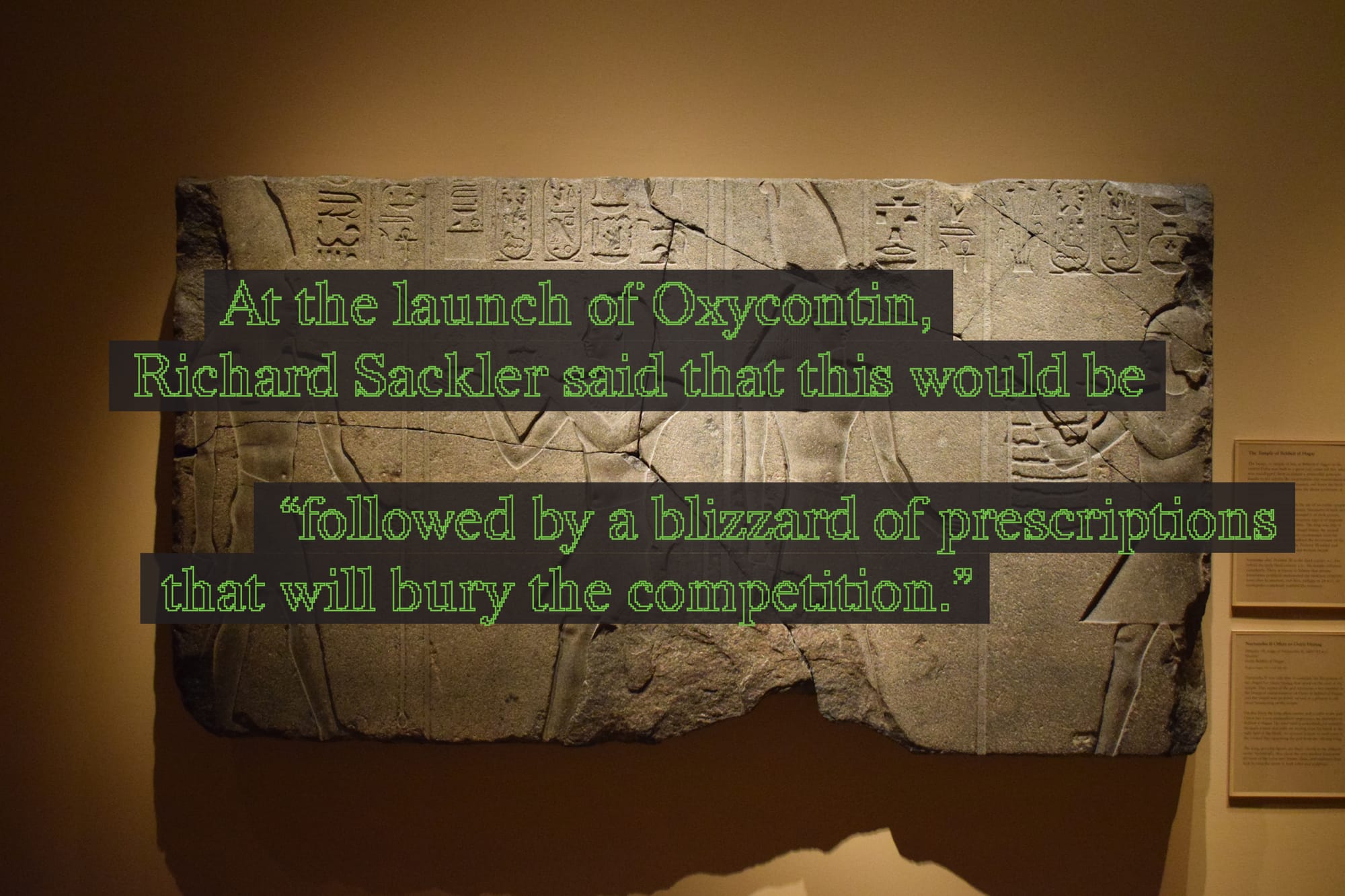 The Sackler Wing, which houses the Temple of Dendur, opened in 1978 with funds provided by the Sackler brothers Arthur, Raymond, and Mortimer. Arthur Sackler died nearly a decade prior to the creation of OxyContin; his wife Jillian has repeatedly claimed that he “had nothing to do with OxyContin,” but DelMarcelle disagrees with her assertion.