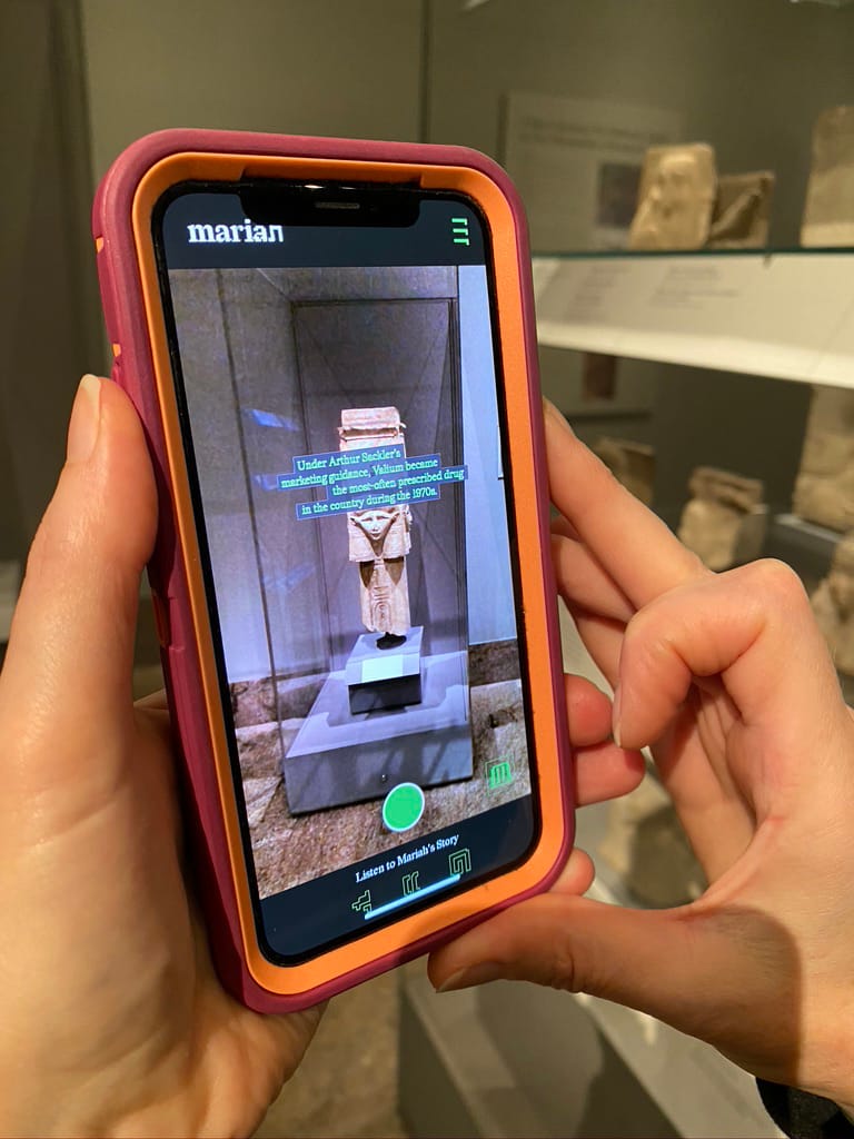 The Mariah App, created by artists Adam DelMarcelle and Heather Snyder Quinn, uses the smartphone’s camera to prompt visuals with facts and figures about the Sackler’s family involvement in the opioid crisis when you point the camera toward different artifacts in the Egyptian galleries of the Sackler Wing. The app also launches video clips telling Lotti’s story and audio recordings narrated by her mother, Rhonda. In addition, the app renames the wing into the “Mariah Lotti Memorial Gallery.”