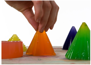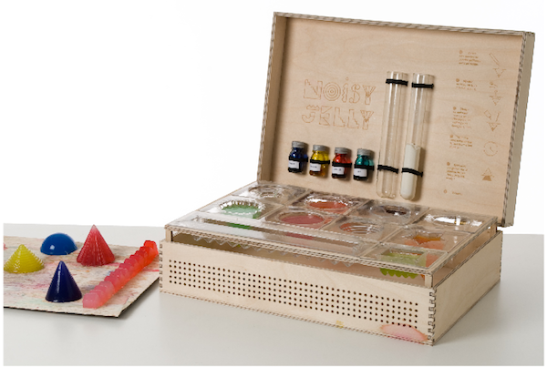 Noisy Jelly is a “noisy chemistry lab” with different molds and mixes that allow you to create a variety of shapes. Relying on Arduino and Max/Msp, the jelly shapes create specific sounds when brought into contact with your finger.