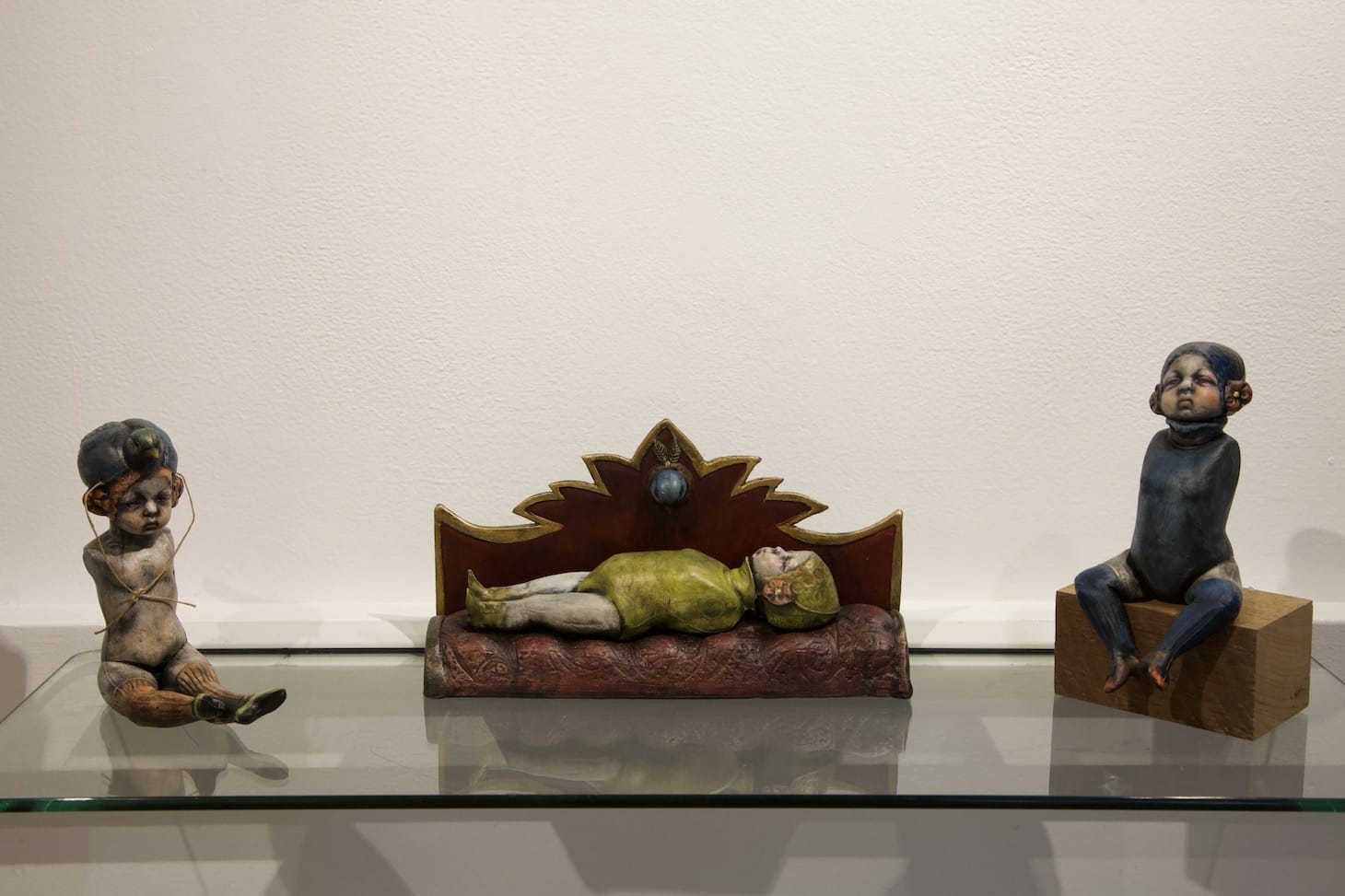 One of the last pieces Gibbons completed before her death consists of two three-inch, armless clay figures (representing her two children) standing on stiff legs on either side of a similar figure (representing Gibbons) lying on a couch. This piece embodies her trademark practice of using commercial doll molds and slip casting and then altering their surfaces. The nostalgic doll heads invite the viewer in, but a closer look reveals a slightly eerie appearance. In an interview in 2018, Gibbons stated that her goal in using this technique was to “combat what’s supposed to be perfect.”