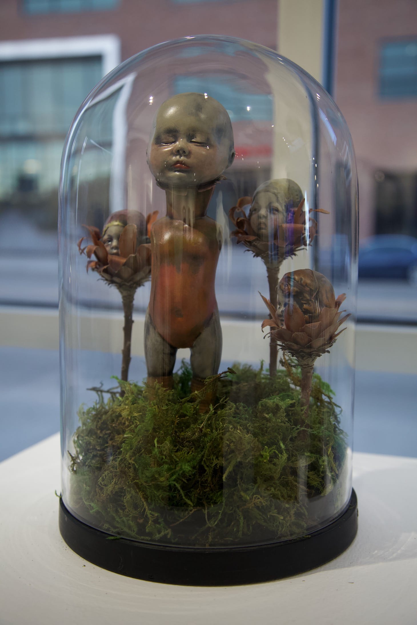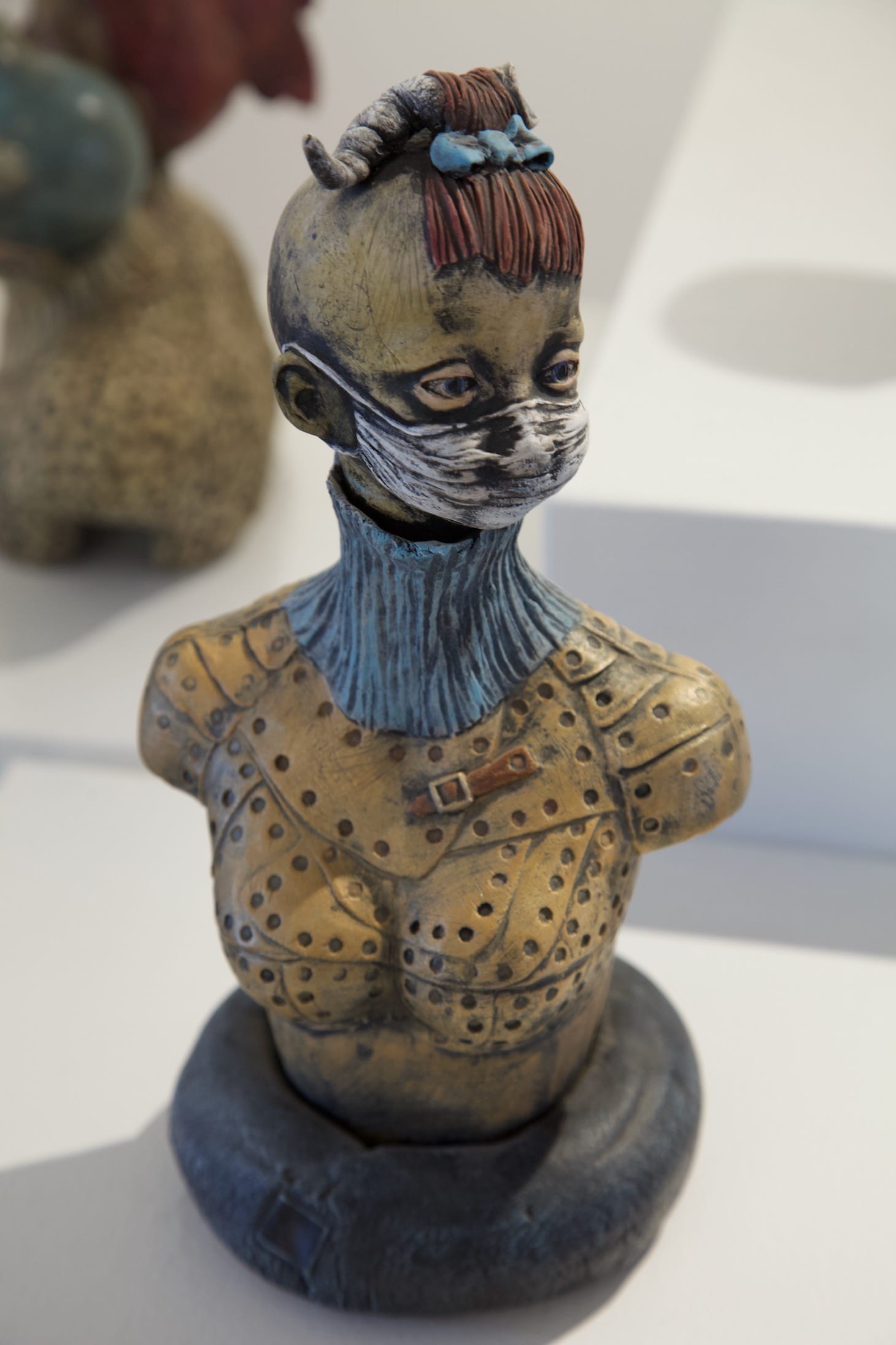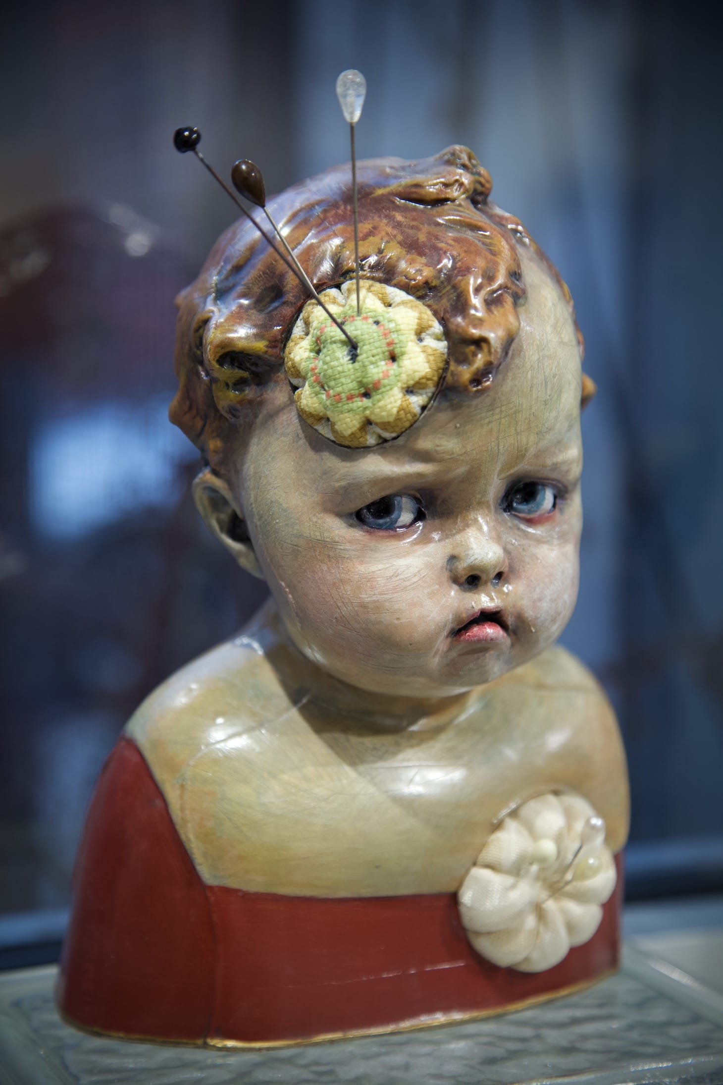 Gibbons’s work is playful yet grim, and contains recognizable elements. She used waxes, inks, washes, and resin to achieve shadows and texture in her clay pieces, and would incorporate found objects and organic matter into her work. A piece from the “Pins and Needles” collection features a sorrowful, blue-eyed, slip-cast baby head with a quarter-sized pin cushion on the side of its head. Like all of Gibbons’s pieces, this “pinhead” was completed with post-fired finishes.