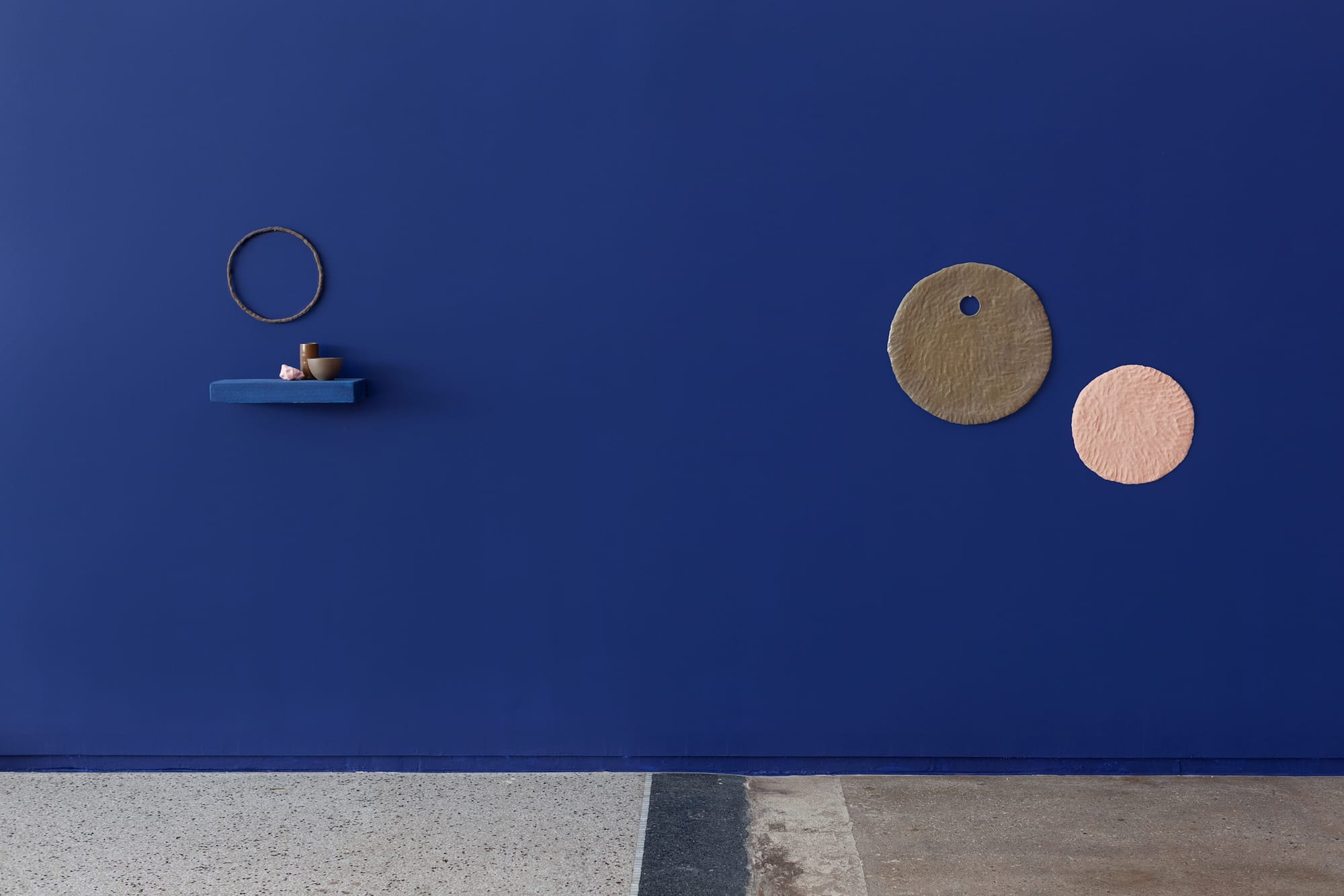 One can also draw a straight line from the William Morris “Blackthorn” wallpaper, which was a lynchpin inspiration for the 2015 show. While the objects on display in that show were exclusively minimalist and white, the colors from the Blackthorn palette have bled into the current body of ceramics, presenting fields of color punctuated by contrasting colors and broken occasionally by hazy scrims of fleshy silicon. This progression beautifully encapsulates the way Hermann is in conversation with her own practice as it evolves.