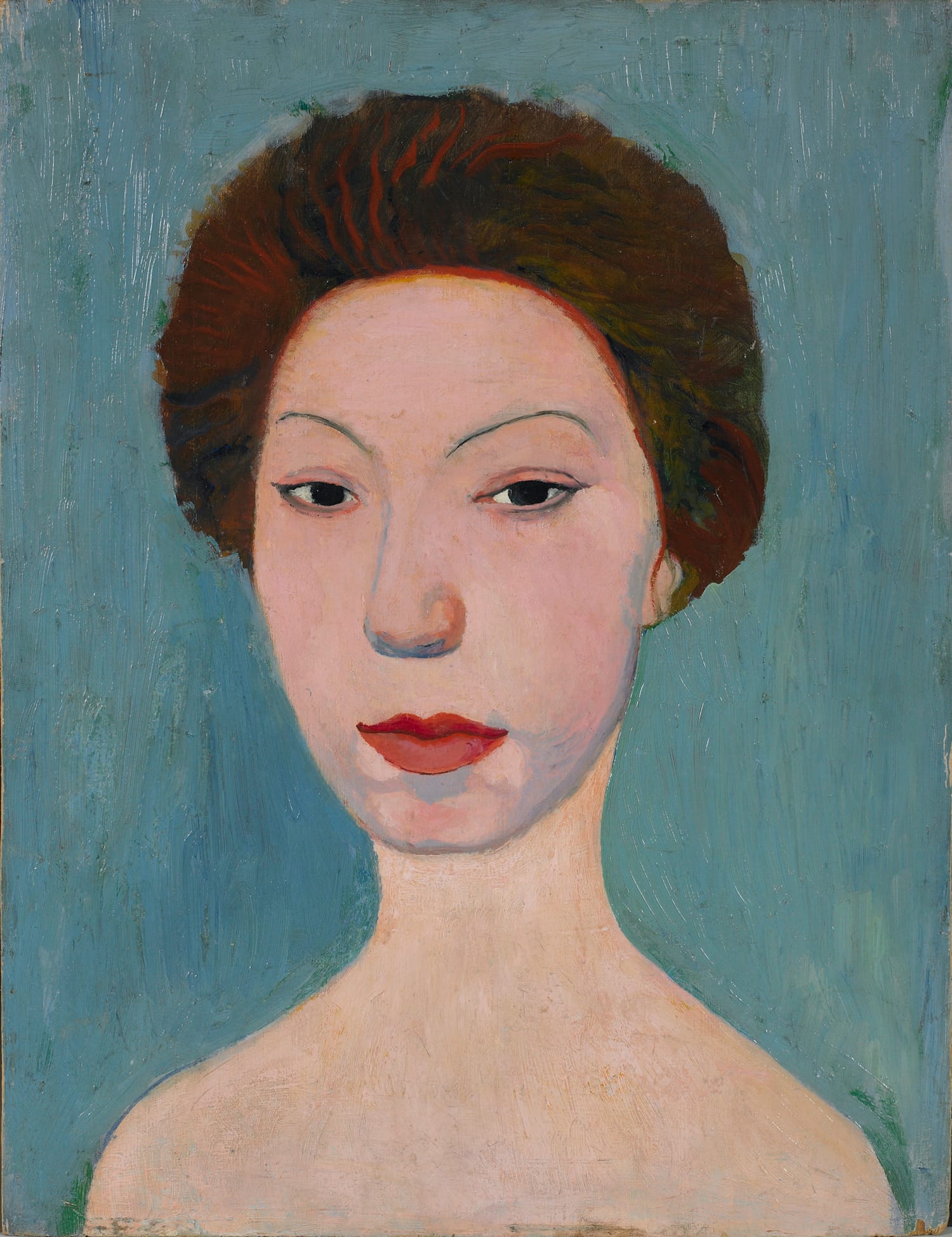 One of the pleasures of a retrospective is watching an artist evolve from early experiments into a mature style. In this period, her work progressed from Cubist-adjacent representational with vivid color and outline to gauzy pastel images of females that, like Futurist works of the period, implied movement. They also implied same-sex love.