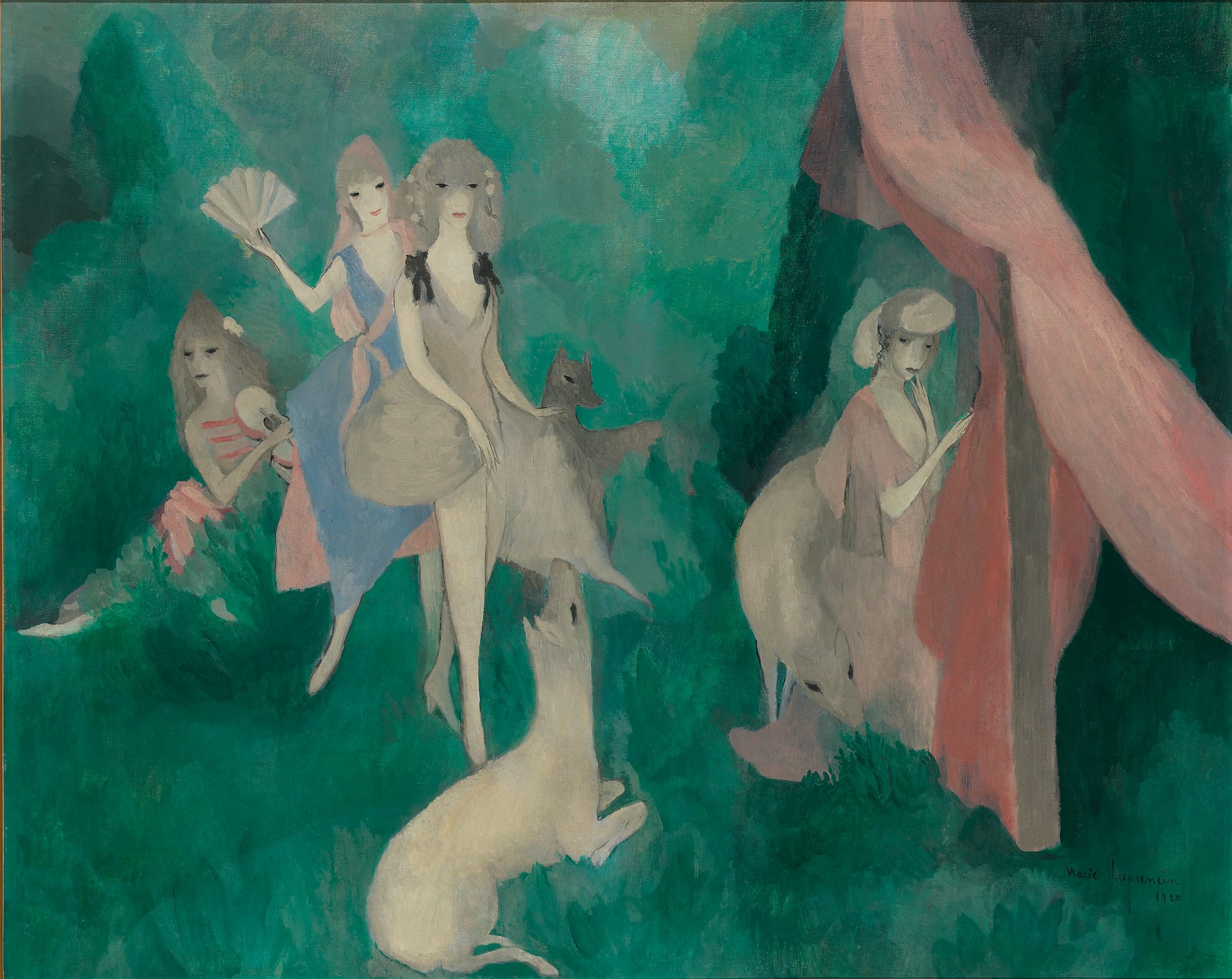 A contemporary observer remarked of Laurencin that “She can paint a girl with eyes like a doe, and a doe with eyes like a girl.” But isn’t it also possible that for the painter, women and does were hybrid creatures in a sylvan fairy tale that takes place in a world without males?