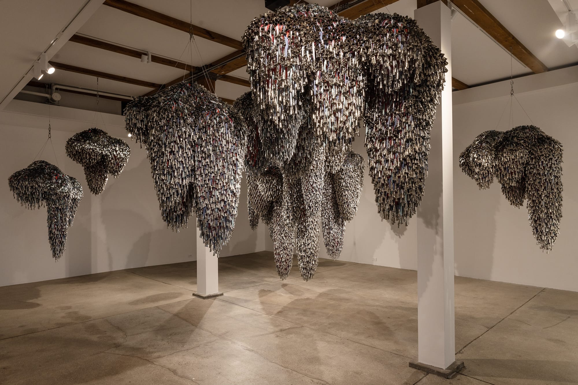 The work feels organic, despite the high-shine finish of the tin. The biomorphic sculptures suggest a variety of shapes, from fruit-like forms waiting to be plucked, to stalactites stretching down from a cavern’s ceiling; there is a sense of growing, of emerging, of becoming. Beyond its references to Indigenous histories, materials, and biophilia, the work also evokes the late 1960s Italian Arte Povera movement that used humble, domestic objects to break down the boundary between everyday life and art. The sculpture “Untitled (Living Sculpture)” (1966) by Marisa Merz, who is often associated with the movement, has the same sense of taking on a life imbued by the artist, viewer, and environment.