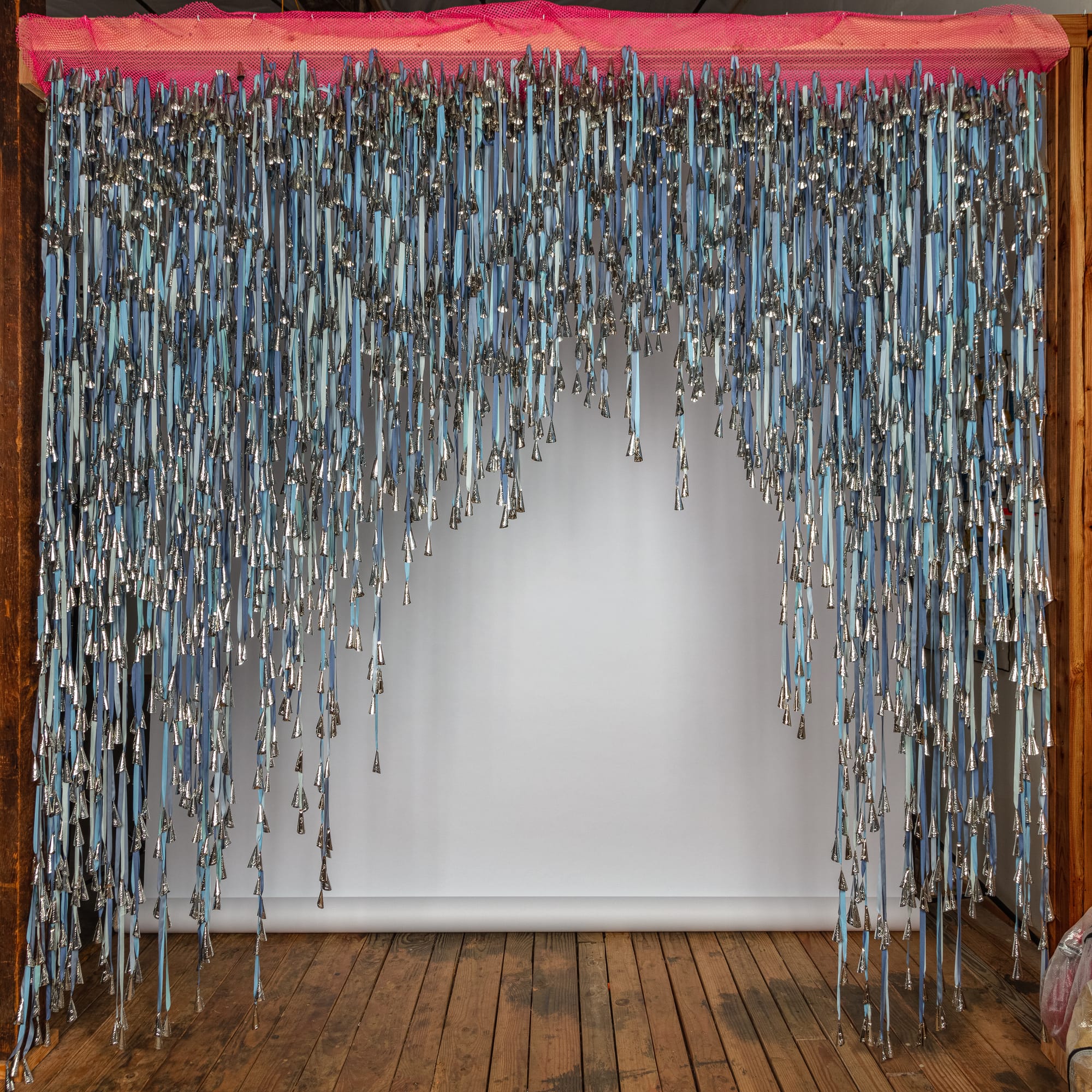 Underneath the gleaming jingles are glimpses of shocking pink mesh, acting as the sculpture’s connective membrane, from which soft blue satin ribbons, which reference Indigenous regalia and fashion, extend down and secure the jingles to the armature of the work. Watt shared that these colors represent her connection to the sky, reflecting on how the changing light dances through the atmosphere at sunrise and sunset, inspiring the show’s title (Sky Dances Light). The installation is suffused with a sense of wonder, dazzling the viewer with a multisensory environment. Touch is at the core of this body of Watt’s work. The artist invites viewers to place their hands on the sculptures, play with them, and activate their sonic qualities through embrace — something that is, more often than not, diametrically at odds with visitor protocols and policies in galleries and museums. Yet, it is through this touch and activation that the works come to life, hold value, and become a resource to the community. The show is playful, beckoning the act of engagement and jubilance, healing and care.