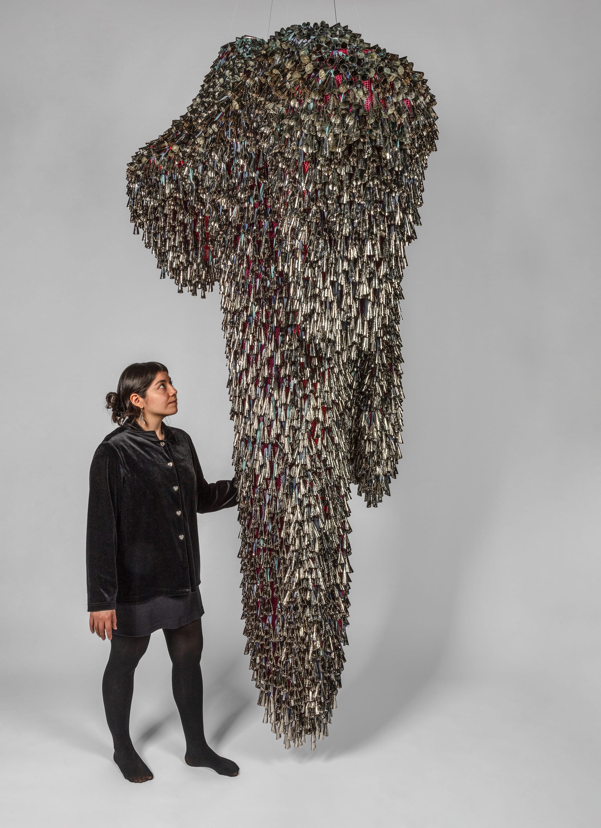 As you enter the exhibition through a curtain dripping with tin-cone jingles (metal discs that are rolled into a cone shape), the chimes brush up against one’s body and create a soundscape as you enter the space. The sculptures inside the gallery are also made of jingles, which are commonly used in Indigenous communities dating back to the 1800s, when individuals began cutting out and curling up the lids of circular tobacco containers to make the conical objects. These were used as adornments on regalia to be worn by dancers, both in healing ceremonies and powwow dances.