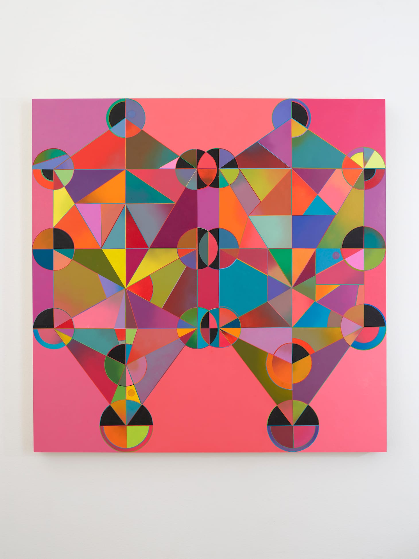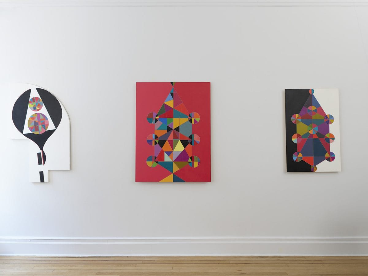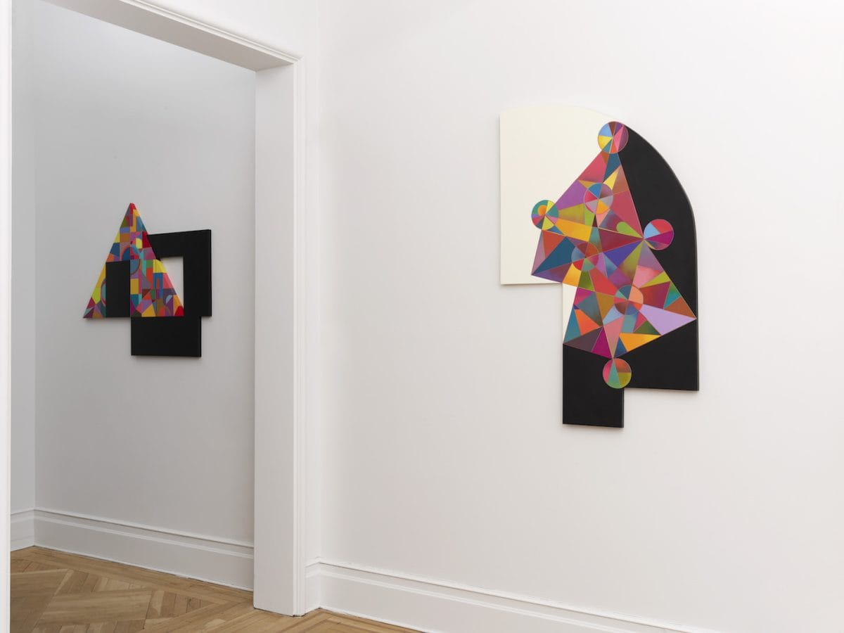 Lerner’s new works evoke an asymmetrical kaleidoscopic hum, as geometric forms and multiple hues dance around each other.