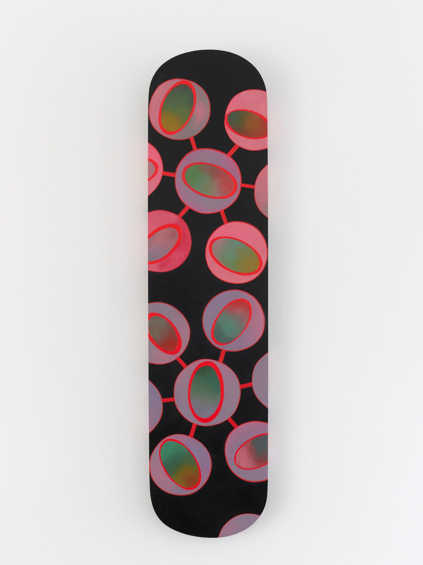Additionally, each of the ground's 10 separate sections is a different density of violet, magenta, and pink. By modifying the color, Lerner breaks down the hierarchy between figure and ground.