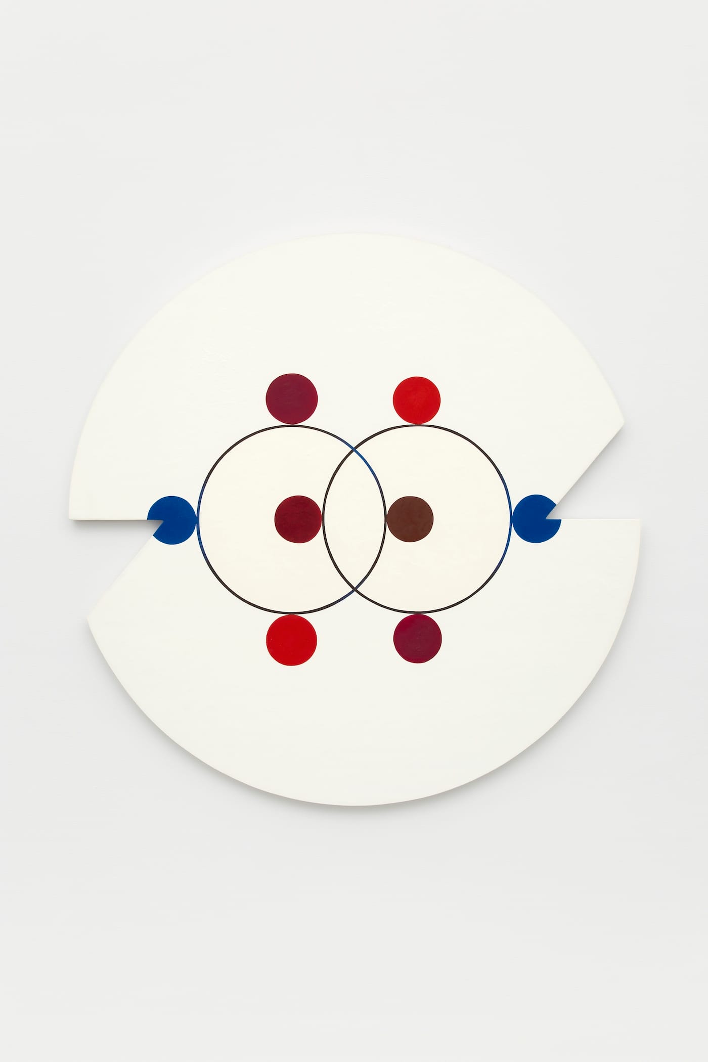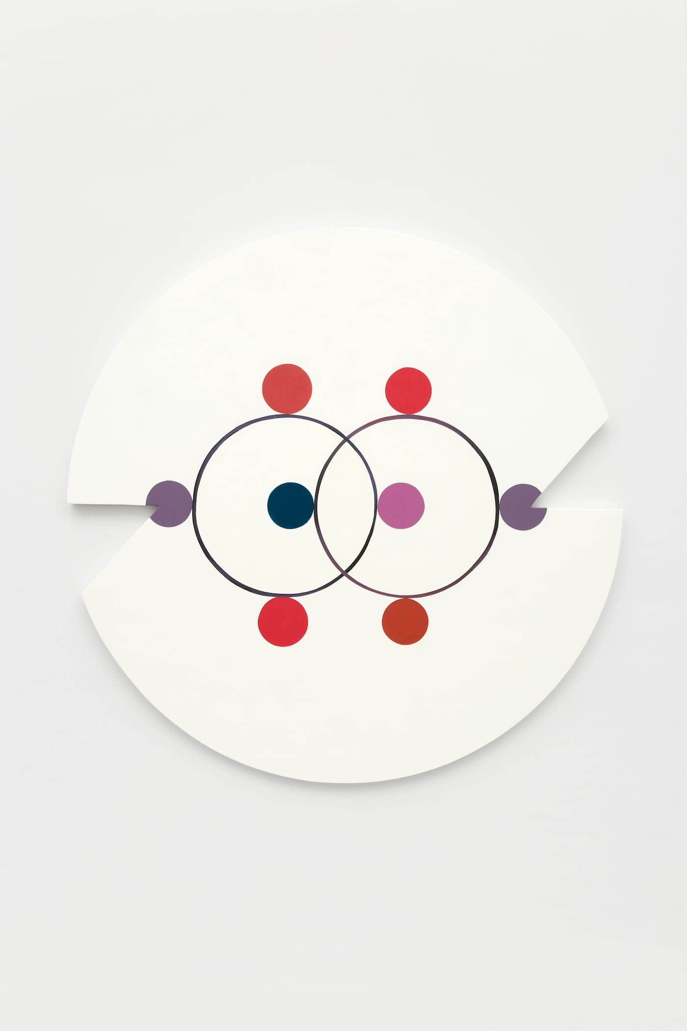 As pendants, the pair becomes a meditation on time passing. In both paintings, two central circles overlap like a Venn diagram. Eight smaller, solidly colored circles border their circumferences, four to a circle. Due to the Venn-like overlap, one small, colored circle in each group of four maintains a dual function, as both the center point of one larger circle and a border element on the other.