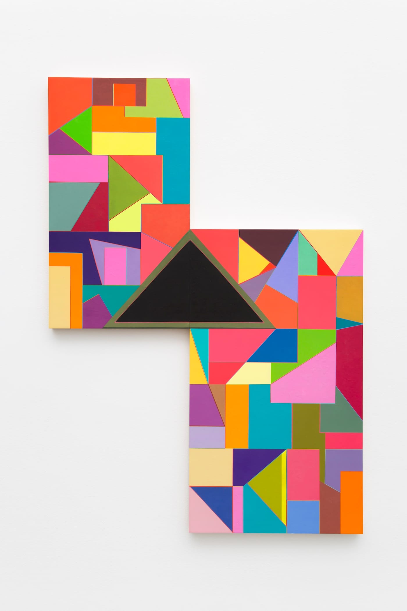 In “Second Sight” (2017), the eccentric shape of the wood panel support seems to have been derived from two different-sized rectangles partially sharing a single edge. The rectangle on the left is smaller than the one on the right and rises above it, giving the impression that the one on the right has slipped down. A black isosceles triangle outlined in khaki green, with its apex at the uppermost point of contact between the two panels, forms a kind of hinge between them.