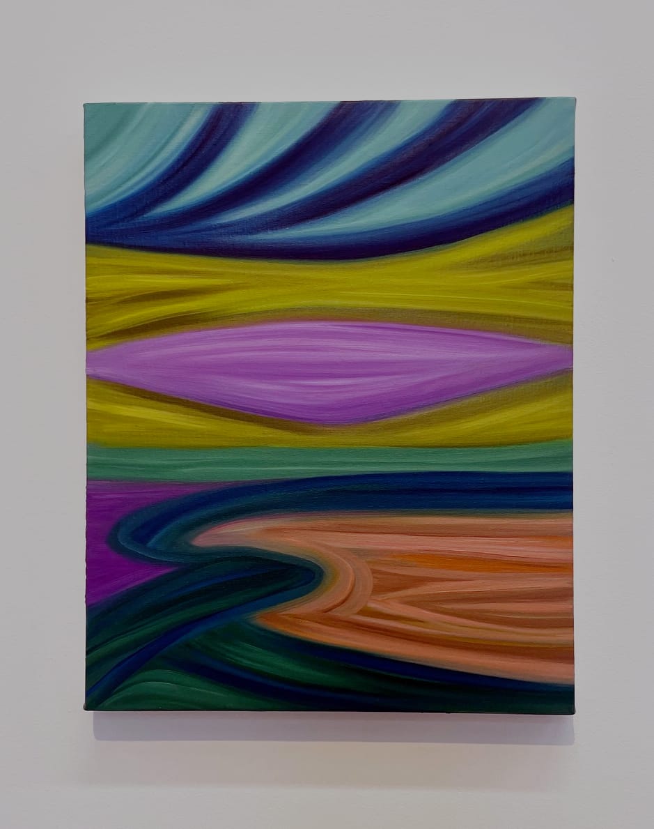 Perez Simōez has mentioned in interviews that she is inspired by the Baroque movements in her native Brazil and Europe. This offers some hint as to the volumetric heft she deploys to dramatic effects. Sunrise and sunset, for instance, are the main events of the first two untitled paintings. In the former, a golden glow lays flat like a pancake on bands of thick lavender, blue, and gray, which could depict either soil or water. Here, light is a self-contained solid rather than an effect; its luminosity hardly alters the adjacent colors or forms. The sun is more literal in the second painting, and yet even here the landscape opens like a petal, suggesting that this spectacle is a quasi-mystical portal to reverie rather than a matter-of-fact depiction of nature.